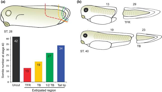 Figure 2. The Xenopus tailbud does not regenerate. (a) Stage 28tadpole key showing regions extirpated and corresponding bar graph of the number of somites formed by Stage 40. Colour of dotted line indicates extirpated region in bar graph. Uncut tadpoles generate 42 somites. Removal of the tail forming region (TFR, which includes trunk derived post anal tail tissues), leaves only 13 somites. Removal of the anatomical tailbud (TB) leaves 19 somites, and removal of smaller parts of the tailbud results in a corresponding decrease in the number of somites absent at stage 40. (b) Drawings indicating the effect of removing either the tail forming region or the tailbud at Stage 28 and culturing the two pieces separately. The extirpated TFR and TB develop autonomously, but the number of somites combined between explant and remaining tadpole is always 42. The âtailâ seen following removal of the tailbud is formed from displaced trunk tissues, and not by regeneration. Data from Tucker and Slack.