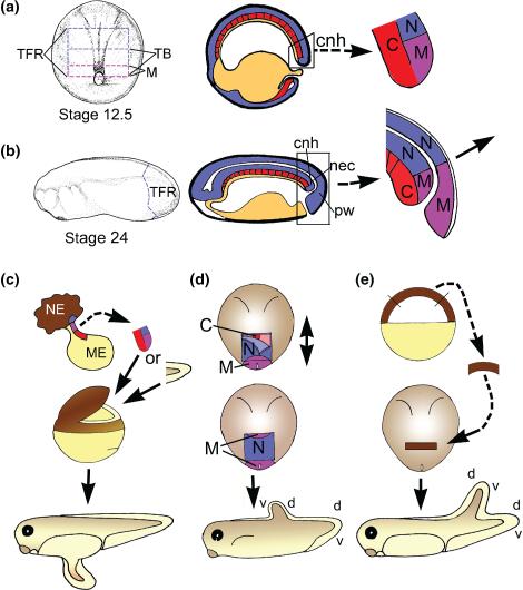 Figure 3. The NMC model for tailbud induction and tail inducing assays. (a) dorsal view of Stage 12.5 Xenopus embryo to show approximate location of the tailbud (TB) and tail forming region (TFR), cross-sectional drawing of same stage through the midline, anterior to left, showing the germ layers and location of the chordoneural hinge (cnh) at the dorsal blastopore lip (boxed). The location of C, N and M regions in the cnh are indicated. B) side view of Stage 24 embryo with dotted line outlining approximate limits of the TFR, cross section through midline to show germ layers (endoderm = yellow, mesoderm = red, and ectoderm = blue), tailbud (boxed), cnh and posterior wall (pw) and the location of the neurenteric canal (nec). Close up of box shows the location of N, M, and C in the tailbud following neurulation, as determined in Tucker and Slack.[29] (c) Grafts of the hinge region of exogastrulae, which contain unfolded NMC regions, or tailbuds, can induce formation of secondary tails if placed inside the blastopore cavity of a blastula stage embryo (einsteck graft).[29] NE, neuroectoderm and ME, mesendoderm. (d) 180° rotations of the neural plate at Stage 13 result in the formation of two new N/M boundaries. The posterior one lies over C and is induced to form a secondary tail in the normal location, the original N/M boundary has been exposed to C and so develops into a tail with reversed dorsal (d) ventral (v) polarity and the most anterior one does not form a tail, as it has not received a C signal. (e) Tailbud inducing activity assay, animal caps expressing test genes are removed at Stages 9–10 and trimmed into 100 × 600 μM rectangles before inserting into the neural plate of a host Stage 13 embryo.[27] Ectopic tails may be formed from the graft if they contain tailbud-like activity. In this case, the dorsal ventral polarity seems to come from the host. Germ layers in A and B are coloured as standard: Blue for ectoderm, red for mesoderm and yellow for endoderm. The M region is mesodermal in fate but ectodermal in origin and is therefore coloured purple. Data from Tucker and Slack, and Beck and Slack.[27, 29]