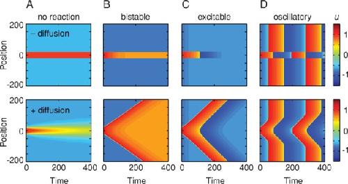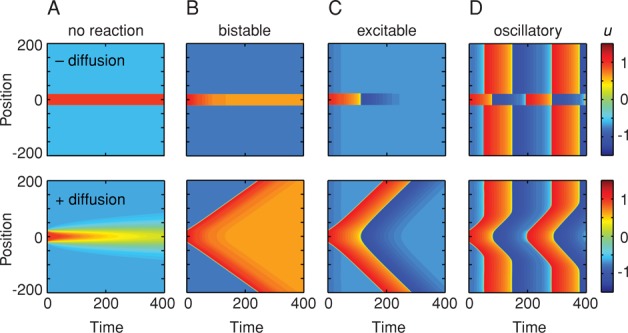 FIGURE 3:. Three types of trigger waves from coupling the FHN reactions to diffusion. The system is assumed to have one spatial dimension (represented on the y-axis); it is essentially a long, thin tube. The values of u as a function of time and position are represented by a heat map color scale. In all cases we assumed that the system has a high initial value of u in the middle of the tube over a width of 40 units (u(t = 0) = 1) and a low initial value of u elsewhere (u(t = 0) = –0.6). The initial value for v is the same everywhere (v(t = 0) = –0.3). For the oscillatory case, we also assumed that the frequency of the oscillations is higher in the middle of the tube (b = 0.5) than in the rest of the tube (b = 1), acting as a pacemaker for the whole system. In the top panels there is no diffusive coupling (D = 0), while in the bottom panels diffusion is included (D = 1). The FHN parameters are the same as those shown in Figure 2. |