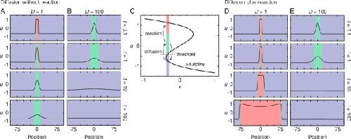 FIGURE 4:. Diffusion can push the system across a threshold. (A, B) Diffusive spreading of a high-u state in the absence of reaction for two different diffusion coefficients. The values of u as a function of position and time are depicted both as curves and in a simplified red-green-blue heat map representation. Increasing the diffusion coefficient allows some regions within the low-u region to attain moderately high (green) levels of u more quickly, but for a shorter duration. (C) Phase plot for one point in space that is initially in the low-u region. Diffusion moves the value of u across the threshold into the green region, but in the absence of reaction, eventually returns it to the blue region. If the FHN reactions are fast enough, they can capture the suprathreshold trajectory and convert this point in space to a high-u (red) state. (D, E) Diffusion plus reaction allows self-regenerating trigger waves to propagate outward (D) unless the diffusion coefficient is too high (E). |