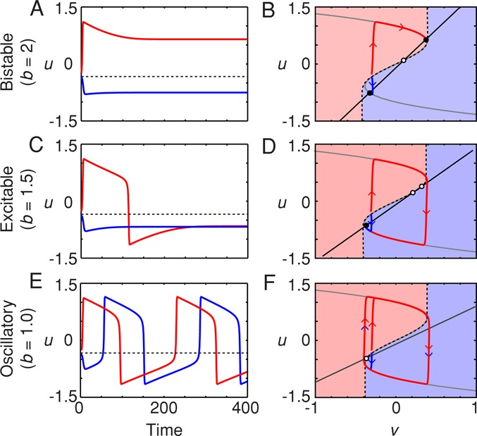 FIGURE 2:. Different types of dynamics from the FHN model. (A, C, E) Time course; (B, D, F) phase plots. (A, B) Bistability. For b = 2, the system is bistable, with two stable steady states (B, filled circles) and one saddle point (B, open circle). For the value of v(t = 0) assumed here (v(t = 0) = –0.3), trajectories beginning above a threshold value of u (A, dashed line) go to the high-u stable steady state, whereas those beginning below the threshold go to the low-u stable steady state. In the phase plane, a separatrix (dashed curve) divides the starting points that approach the high-u stable steady state (pink area) from those that go to the low-u steady state. (C, D) Excitability. For b = 1.5, there is a single stable steady state plus a saddle point and an unstable steady state. Trajectories beginning above the threshold (C) or the separatrix (D) yield a pulse of u and circle the unstable steady state before settling down to a low steady-state value of u. Those beginning below the threshold do not yield a pulse of high u. (E, F) Oscillations. For b = 1.0, the single steady state is unstable. From all initial conditions (except starting right on the unstable steady state), the trajectories approach the same stable limit cycle, although from above the threshold, they go first to the upper limb of the u-nullcline, and below the threshold, they go first to the lower limb. A, C, and E are time courses; B, D, and F are phase plots. In each case, a = 0.1, ε = 0.01, v(t = 0) = −0.3, and u(t = 0) = −0.25 (red trajectories) or −0.35 (blue trajectories). |