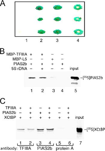 FIGURE 1. TFIIIA interacts with PIAS2b and XCtBP. A, colony lift filter assay used to measure interactions between PIAS2b and TFIIIA in a yeast two-hybrid system. Triplicate assays are presented in each column, with the following bait/prey combinations: lane 1, lamC/T antigen (negative control); lane 2, TFIIIA (fingers 1–3)/PIAS2b; lane 3, TFIIIA (fingers 1–4)/PIAS2b; lane 4, p53/PIAS2b. B, MBP-TFIIIA or MBP-L5 (negative control) fusion protein was incubated with reticulocyte lysate containing 35S-labeled PIAS2b. The fusion protein was recovered by binding to amylose resin. Precipitated samples were analyzed by SDS-PAGE followed by autoradiography. C, reticulocyte lysate containing 35S-labeled XCtBP was incubated with either TFIIIA or PIAS2b alone or with both proteins together. Complexes were collected by immunoprecipitation using either anti-TFIIIA (lanes 1 and 2) or anti-PIAS2b (lanes 3 and 4) antibody adsorbed to protein A-Sepharose. Control assays used unmodified protein A-Sepharose. Precipitated samples were analyzed by SDS-PAGE followed by autoradiography. |