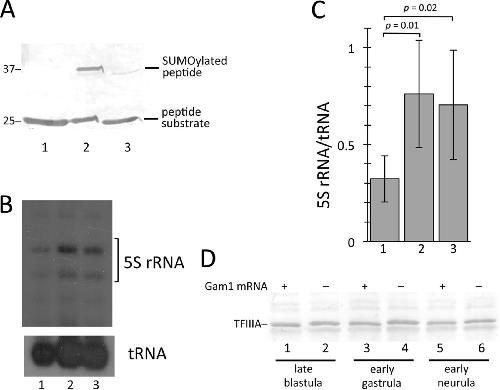 FIGURE 4. Depletion of SUMOylation activity prevents repression of oocyte 5 S rRNA genes. A, SUMO activation (E1) activity in extract prepared from Gam1-injected embryos was measured by Western blot analysis using a 25-kDa SUMO substrate peptide. Lane 1, peptide alone; lane 2, peptide incubated with extract from water-injected (control) embryos; lane 3, peptide incubated with extract from Gam1-injected embryos. The reactions in lanes 2 and 3 also contained E2 (Ubc9) enzyme, SUMO1, and ATP. Positions of molecular weight markers (in kilodaltons) are indicated. B, one-cell embryos were injected with [32P]UTP and TFIIIA mRNA, which activates transcription of the oocyte-type genes after the midblastula transition, or Gam1 mRNA. RNA was isolated at early gastrula stage, and three embryo equivalents were analyzed by electrophoresis/autoradiography. Lane 1, control embryos injected with [32P]UTP only; lane 2, injection with TFIIIA mRNA (7 ng); lane 3, injection with Gam1 mRNA (5 ng). C, autoradiographs for four experiments were scanned, and 5 S rRNA was quantitated relative to tRNA using ImageJ software. The ratio is given in arbitrary units. Error bars indicate mean ± S.D. D, one-cell embryos were injected with Gam1 mRNA (lanes 1, 3, and 5) or water (lanes 2, 4, and 6). Whole cell extract was prepared, and four embryo equivalents were analyzed by Western blot developed with TFIIIA antibody. |