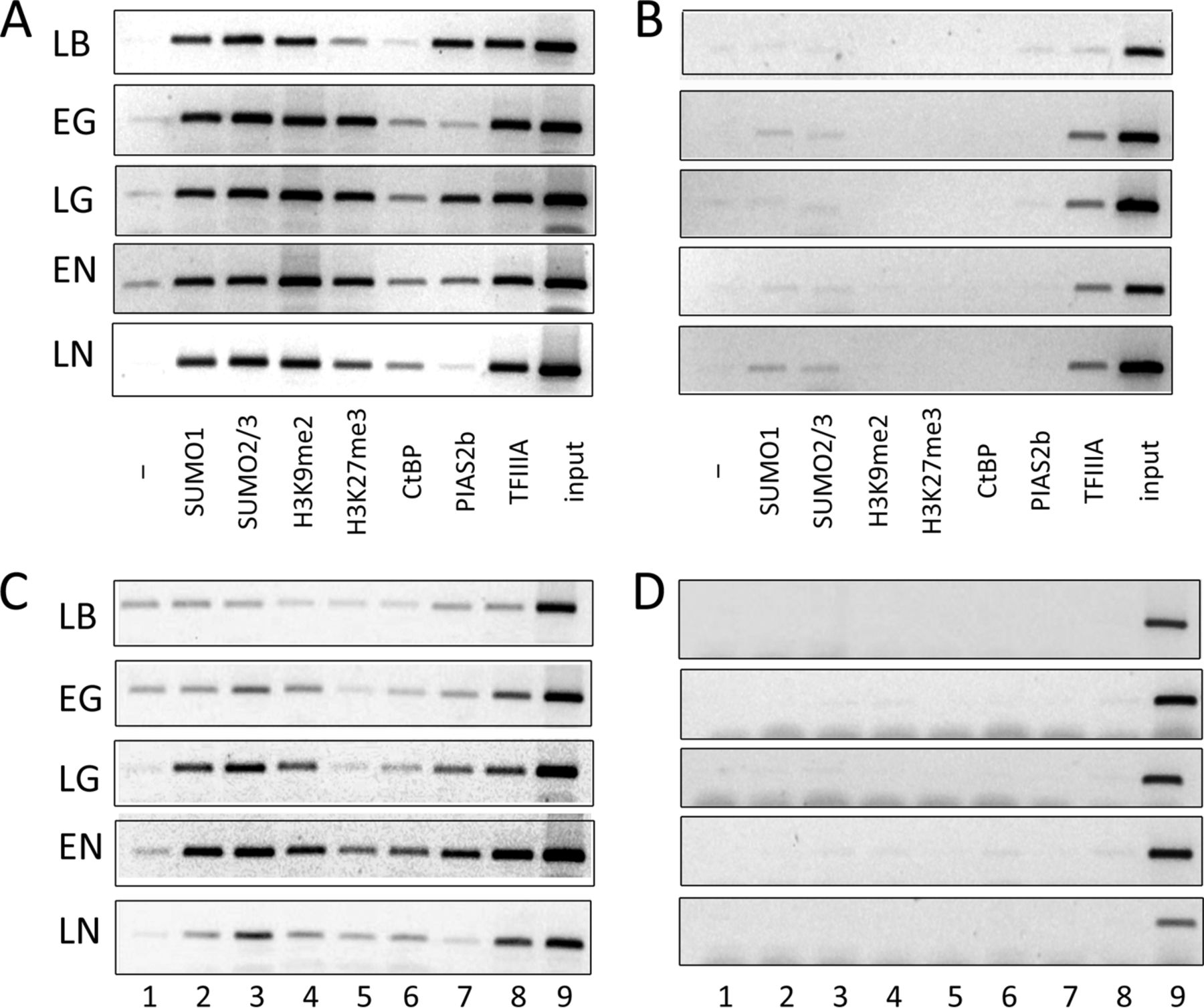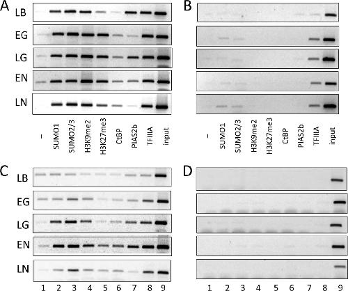 FIGURE 5. Occupancy of the 5 S rRNA genes during early development. ChIP assays of embryos at the indicated stage of development tested for the presence of the specified protein or histone modification. A, oocyte 5 S rRNA genes. LB, late blastula stage; EG, early gastrula stage; LG, late gastrula stage; EN, early neurula stage; LN, late neurula stage. B, somatic 5 S rRNA genes. C, oocyte 5 S rRNA genes from Gam1-injected embryos. D, somatic 5 S rRNA genes from Gam1-injected embryos. The antibodies used were as follows: lane 1, beads only (negative control); lane 2, SUMO1; lane 3, SUMO2/3; lane 4, H3K9me2; lane 5, H3K27me3; lane 6, CtBP; lane 7, PIAS2b; lane 8, TFIIIA; lane 9, input. |