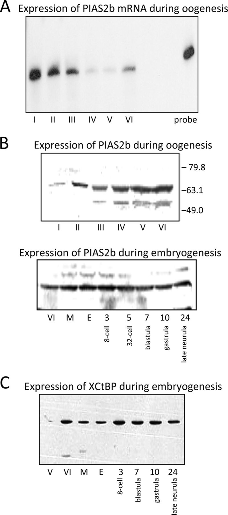 FIGURE 2. Expression of PIAS2b and XCtBP during early Xenopus development. A, RNase protection analysis of PIAS2b mRNA. Total RNA from 10 oocytes at the indicated Dumont stage (85) was hybridized with an antisense 32P-labeled RNA probe. The sample was then digested with RNase One, analyzed on a denaturing polyacrylamide gel, and detected by autoradiography. B, Western blot analysis of PIAS2b. Protein extracts (2 oocyte or 1.5 embryo equivalents) were prepared from developmentally staged oocytes and embryos (86) as indicated, including progesterone-matured oocytes (M) and unfertilized eggs (E). The position of molecular weight standards (in kilodaltons) is indicated. C, Western blot analysis of XCtBP. |