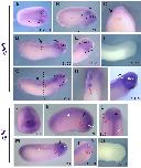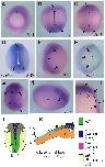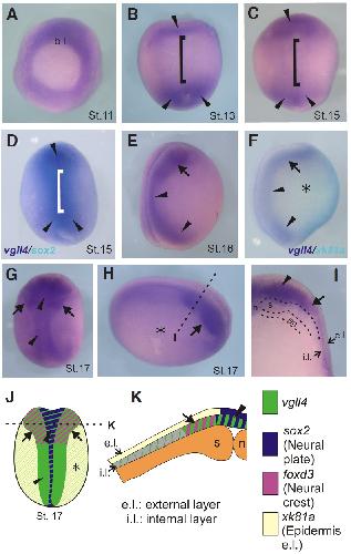 Fig. 4. Spatio-temporal expression pattern of vgll4 during early development by in situ hybridization. (A) Vegetative view. (B-D, G) Dorsal view, anterior to the top. (E, F) Lateral view, dorsal to the left, anterior to the top. (H) Lateral view, dorsal to the top, anterior to the right. (I) Transversal section. Black dashed line in H indicates the position of the cut made to give cross-section in I. (D) Double in situ hybridization for vgll4 (purple) and sox2 (turquoise). (F) Double in situ hybridization for vgll4 (purple) and xk81a (turquoise). (B-D) Arrowheads, anterior and posterior vgll4 expression in the neural plate. Brackets, lack of expression in the middle neural plate. (F, H) Asterisk, weak vgll4 expression in the prospective epidermis. Arrow, neural folds vgll4 expression. Arrowhead, neural plate expression. (J, K) Schematic diagrams summarizing the expression of vgll4l and neural plate (sox2), neural crest (foxd3) and epidermal (xk81a) markers. (J) Dorsal view. (K) Transversal section. References: b.l., blastopore lip. e.l., external layer. en, endoderm. i. l.: internal layer. n, notochord. s, somites. |
