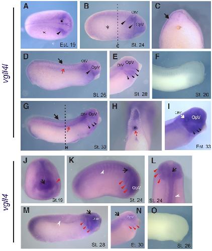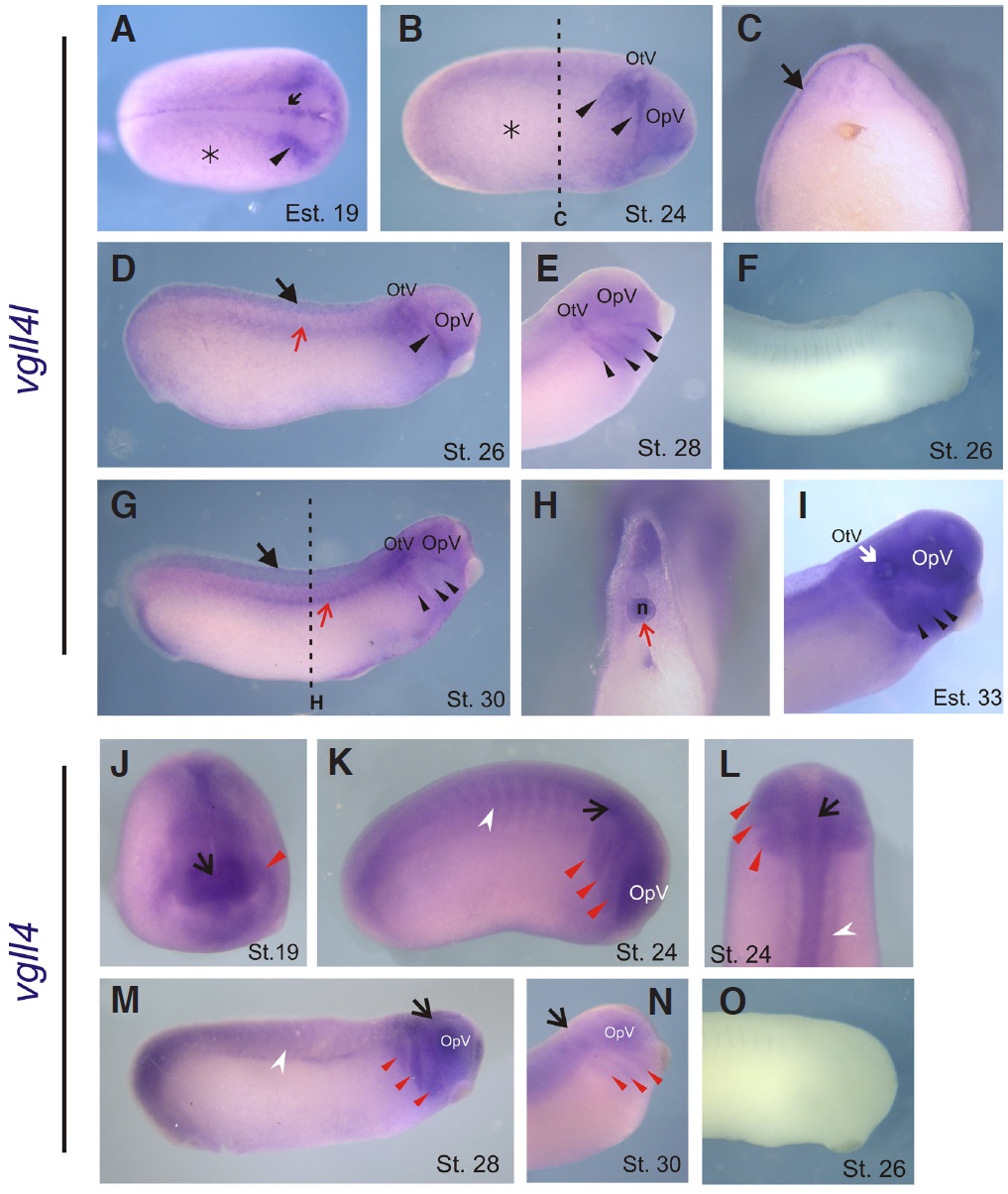 Fig. 5. Expression of vgll4l and vgll4 at advanced neurula and tailbud stages. (A-I) vgll4l expression. (J-O) vgll4 expression. (A) Dorsal view, anterior to the right. (B, D, F, G, K, M, O) lateral view, anterior to the right. (C, H) Transversal section. Black dashed lines in B and G indicate the positions of the cuts made to give cross-section in C and H. (E, I, N) Higher-magnification views of head region. (J) Anterior view, dorsal to the top. (L) Dorsal view, anterior to the top. (F) Negative control, vgll4l sense probe. (A-B) Asterisk, vgll4l epidermal expression. (A) Arrowhead: vgll4l neural folds expression. (B, D) Arrowhead, vgll4l expression in the migrating neural crest. E, G, I: Arrowhead, vgll4l branchial arches expression. (C) Black arrow, vgll4l expression in the internal layer of the ectoderm. (D, G) Black arrow, vgll4l skin expression. (D, G, H) Red arrow, vgll4l notochord expression. (O) Negative control, vgll4 sense probe. (J-N) Arrow, vgll4 expression in the prospective brain. (J-L) Red arrowhead, vgll4 expression in the migrating neural crest. (M-N) Red arrowheads, vgll4 branchial arches expression. (K, L, M) White arrowhead, vgll4 somites expression. n, notochord. OpV, optic vesicle. OtV, otic vesicle. |