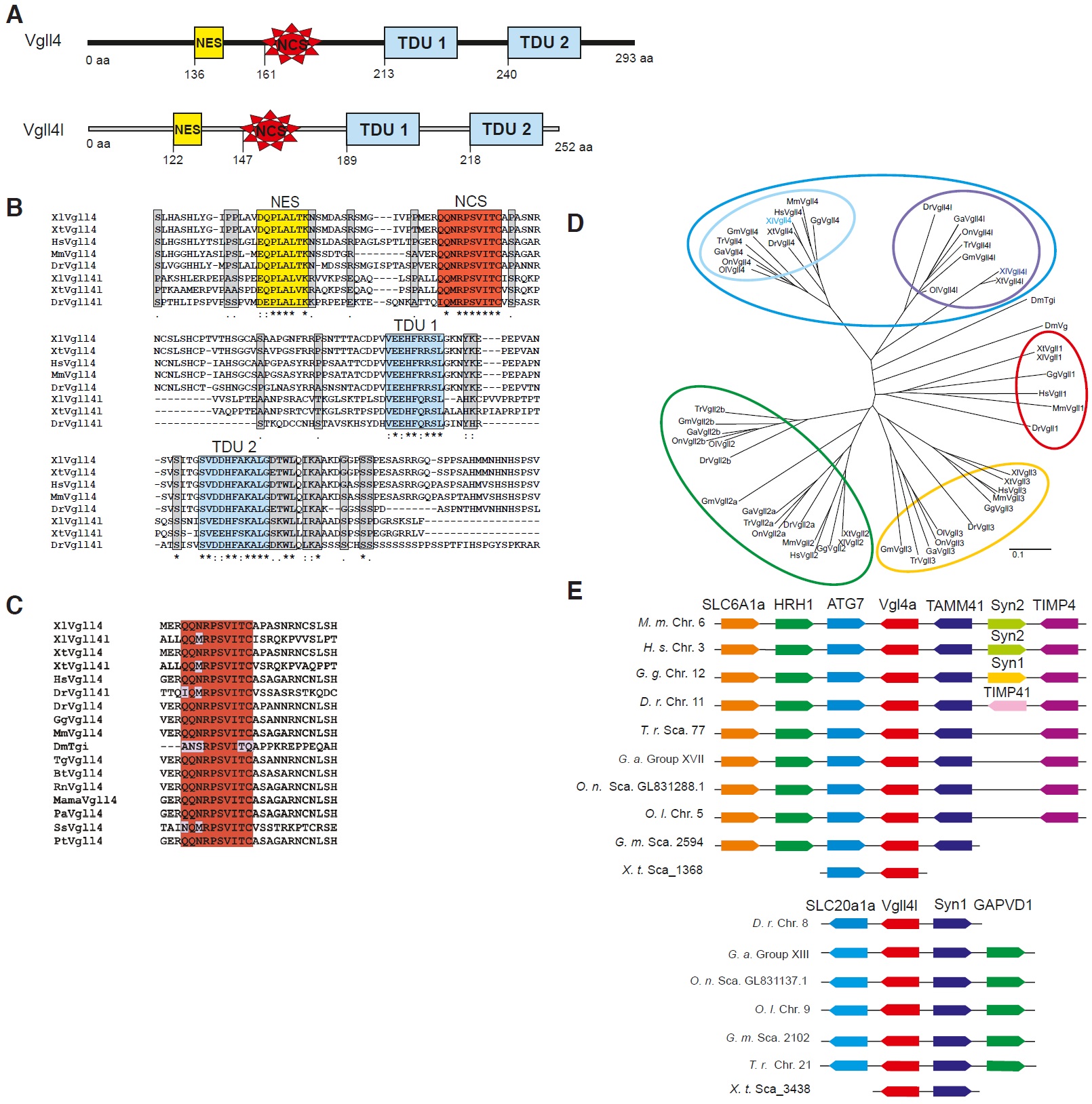 Fig. 1. Protein sequence analysis, structural comparison, family relationships and synteny analysis of Vgll4 and Vgll4l. (A) Protein structure of Vgll4 and Vgll4l. NES, nuclear export signal; NCS, novel conserved sequence;TDU, TONDU domain. (B) Protein sequence alignment comparing Xenopus laevis (Xl) Vgll4 and Vgll4l with Xenopus tropicalis (Xt), human (Hs), mouse (Mm), and zebrafish (Dr). Conserved Amino acids are shown in grey. (C) A wide comparison of the NCS region between different species. Chicken (Gg), Drosophila melanogaster (Dm), Taeniopygia guttata (Tg), Bos taurus (Bt), Rattus norvegicus (Rn), Macaca mulatta (Mama), Pongo abelii (Pa), Salmo salar (Ss), Pan troglodytes (Pt). (D) Unrooted phylogenetic tree showing the evolutionary relationship among different Vgll proteins. The tree was based on amino acid sequence alignment (see Experimental Procedures for details). (E) Analysis of conserved syntenic regions containing Vgll4 and Vgll4l loci in Xenopus tropicalis (X.t.), zebrafish (Danio rerio, D.r.), puffer fish (Takifugu rubripes, T.r.), stickleback (Gasterosteus aculeatus, G.a.), medaka (Oryzias latipes, O.l.), tilapia (Oreochromis niloticus, O.n.), cod (Gadus morhua, G. m.), human (H.s.), mouse (M.m.), and chicken (G.g.) genomes. Genes are represented as boxes and arrows indicate the orientation of the transcription unit. Boxes with the same color indicate orthologue genes. The genomic regions representations are not to scale to avoid complexity. |