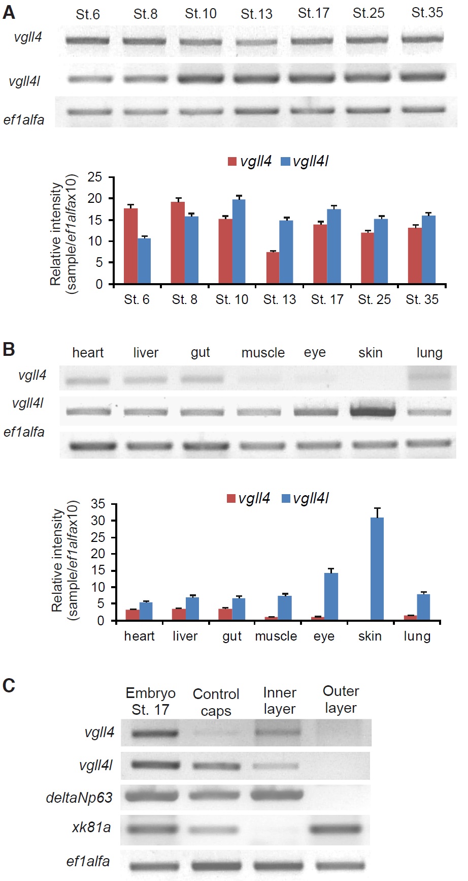 Fig. 2. RT-PCR analysis of vgll4 gene expression in embryos and adult tissues. RT-PCR was performed on total RNA extracted from embryos at different embryonic stages, adult tissues and internal and external layers of animal caps. ef1alfa was used as loading control. (A) Temporal expression of vgll4 and vgll4l throughout development. (B) Analysis of vgll4 and vgll4l expression in adult tissues. (A,B) Quantifications of gel are shown; the results are expressed as Relative Intensity (sample/ef1alfa X 10). (C) vgll4 and vgll4l expression in isolated layers of the animal cap ectoderm. |