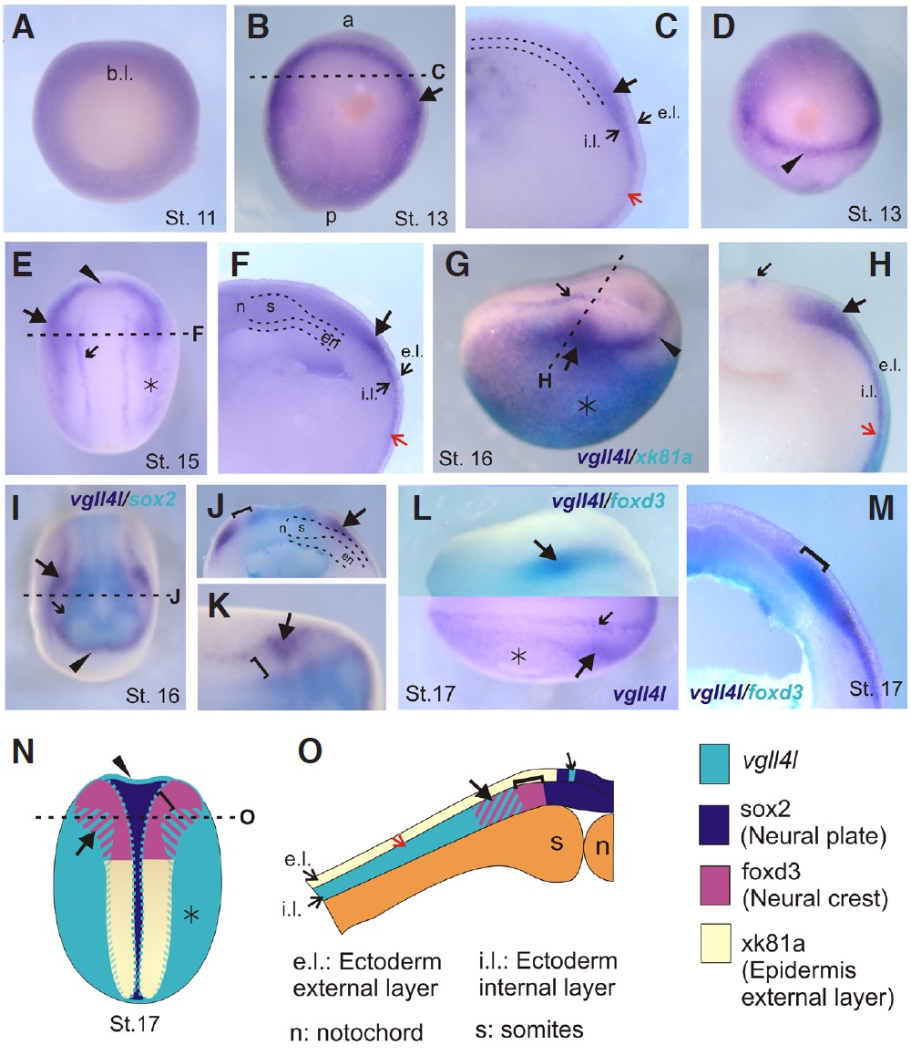 Fig. 3. Spatio-temporal expression pattern of vgll4l during early development by in situ hybridization. (A) Vegetative view. (B, E) Dorsal view, anterior to the top. (D, I) Anterior view, dorsal to the top, anterior to the front. (G) Lateral view anterior to the right. (L) Dorsal view, anterior to the right. (C, F, H, J, M) Transversal sections. (K) Higher magnification view of the anterior region of the embryo shown in I. Black dashed lines in B, E, G, I indicate the positions of the cuts made to give transversal-sections in C, F, H, J. (G, H) Double in situ hybridization for vgll4l (purple) and xk81a (turquoise). (I-K) Double in situ hybridization for vgll4l (purple) and sox2 (turquoise). (L) (upper half) Double in situ hybridization for vgll4l (purple) and foxd3 (turquoise), (M) cross- sectioned embryo labeled by double in situ hybridization for vgll4l (purple) and foxd3 (turquoise). (E, G, L) Asterisk, vgll4l expression in the prospective epidermis. (B, C, E, F, H-L) Large black arrow, vgll4l neural folds expression. (C, F, H) Red arrow, vgll4l expression in the internal layer of the ectoderm. (E, G, H, I, L) Small black arrow, vgll4l row expression surrounding neural plate. (J, K, M, N) Brackets, vgll4l neural folds gap of expression. (N, O) Schematic diagrams summarizing the expression of vgll4l and neural plate (sox2), neural crest (foxd3) and epidermal (xk81a) markers. (N) Dorsal view. (O) Transversal section. References: a, anterior. b.l., blastopore lip. e.l., external layer. en, endoderm. i.l., internal layer. n, notochord. p, posterior. s, somites. |