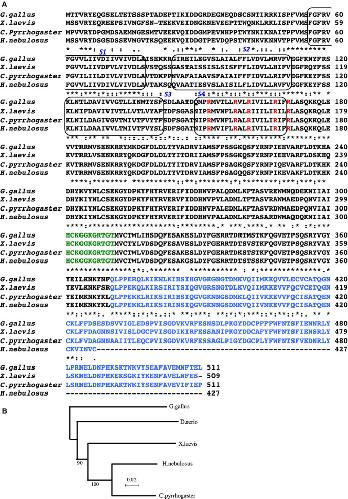 Figure 1. (A) Multiple amino acid alignments of newt (Cynops pyrrhogaster), salamander (Hynobius nebulosus), frog (Xenopus laevis), and chick (Gallus gallus) VSPs. The transmembrane segments (S1–S4) are surrounded by round squares. The conserved arginines in the S4 segment are shown in red. The conserved active site of the phosphatase domain is shown in green. The C2 domain is shown in blue. Note that a part of C2 domain is absent in salamander VSP. (B) Dendrogram of amino acid sequences of VSP orthologs. Bootstrap value is indicated. |