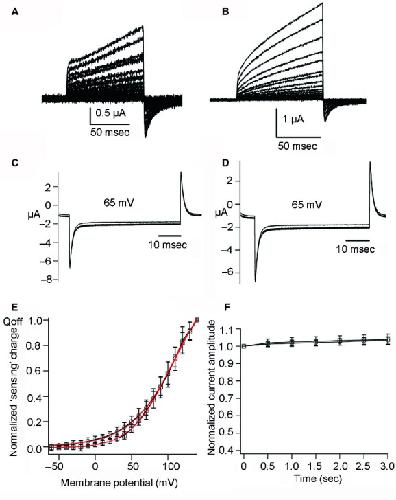 Figure 3. Off “sensing” currents in salamander VSP (Hn‐VSP) and its R153Q mutant. (A) A pulse protocol. Voltage was evoked ranging from −60 to +140 by 10‐mV increments. (B, C) Representative traces of Off “sensing” currents of wild‐type (WT) Hn‐VSP and its R153Q mutant, respectively. Red trace indicates the current at +80 mV. Both On “sensing” and Off “sensing” currents were observed in the R153Q mutant. (D) Qoff‐V curves from WT Hn‐VSP and its R153Q mutant. Red curves indicate plots fitted by Boltzmann equation. V1/2 of the R153Q mutant was 37.0 ± 2.6 mV, n = 4. |