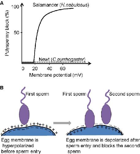 Figure 8. Positive‐going membrane potential controls sperm‐egg fusion in Hynobius nebulosus but not in Cynops pyrrhogaster. (A) A graphical representation of percent polyspermy block. When the eggs were clamped at membrane potentials >20 mV Hn‐sperms (curve) were prevented from fusing with the egg, whereas Cp‐sperms (dash line) were not (from Iwao and Jaffe 1989). (B) Cartoon showing the hypothesis of molecular mechanisms of polyspermy block, based on the ability of sperm to sense change in the egg membrane potential (adapted from Iwao and Jaffe 1989). After the first sperm is successfully fused with egg, the second sperm is prevented from fusion with the egg through VSP activities. In the second sperm, VSP, which could potentially be localized in sperm membrane, senses depolarized egg cell membrane through transient cell fusion and its phosphatase activity downregulates phosphoinositides which may be required for progression of cell fusion event (Ratzan et al. 2011). |