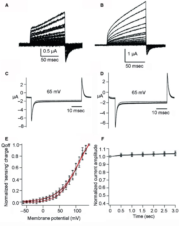 Figure 6. C2‐domain truncated Ci‐VSP and Cp‐VSP mutants lack phosphatase activity. (A, B) Sensing currents recording of C2‐domain truncation mutant of Ci‐VSP and Cp‐VSP, respectively. (C, D) Phosphatase activity of truncated mutant of Ci‐VSP and Cp‐VSP, respectively, measured at 65 mV. (E) Qoff‐V plots for truncated Ci‐VSP (squares) and Cp‐VSP (circles), n = 6 for both. (F) Normalized current amplitudes plotted against time, n = 4 for both Ci‐VSP (squares) and Cp‐VSP (circles). Data in the plots are mean ± SD. |