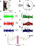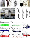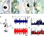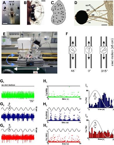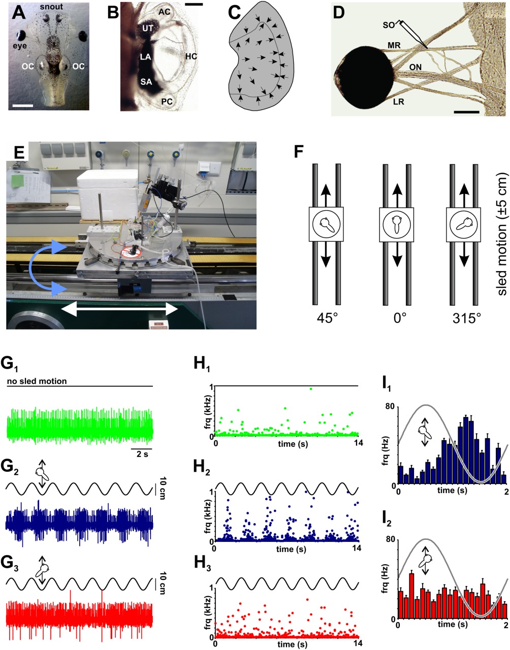 Figure 1 Semiâintact preparation of Xenopus laevis tadpoles for characterizing the spatial specificity and developmental maturation of SO motor nerve responses during horizontal linear translation. (AâD) Photograph of a semiâintact preparation of a stage 55 tadpole, illustrating the preserved anatomical structures (A), the right otic capsule with macroscopically visible semicircular canal and otolith endorgans (B), the hair cell orientation (arrows) on the amphibian utricle (C) and motor nerve innervation of the extraocular muscles of the lefteye (D); scheme, illustrating utricular hair cell orientation (C) was adapted from Straka and Dieringer (2004). (E and F) Linear sled (E) used for application of horizontal translational acceleration (white arrow); stepwise rotation of an adjustable platform (blue arrow) allows reorienting the recording chamber with the semiâintact preparation relative to the translational motion direction (F). (G) Multipleâunit activity of the left SO motor nerve in the absence of motion (G1) and during seven cycles of sinusoidal sled oscillations at 0.5 Hz (±5 cm) with the preparation (pictograms) oriented 45° to the left (G2) or to the right (G3) relative to the translation direction; upper traces indicate sled positional oscillations (negative sine wave indicates forward motion) and lower traces the nerve discharge. (H) Instantaneous firing rate of the three recordings shown in G1â3 (same color code as in G). (I) Averaged firing rates of the SO motor nerve discharge shown in G2,3 as PSTH (±SEM; nâ=â7 oscillations, respectively) for a single cycle; robust modulation occurs when the preparation (pictograms) was oriented 45° to the left (I1), no modulation when the preparation was oriented 45° to the right relative to the translation direction (I2); black sinusoid indicates sled position (negative sine wave indicates forward motion). Calibration bars represent 2.5 mm in A and 0.5 mm in B and D. AC, HC, PC, anterior vertical, horizontal, posterior vertical semicircular canal; LA, lagena; LR, MR, lateral rectus, medial rectus eyemuscle; OC, otic capsule; ON, optic nerve; SA, saccule; SO, SO eyemuscle; UT, utricle.