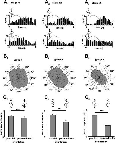 Figure 2 Developmental tuning of translational motionâevoked extraocular motor responses in larval Xenopus. (A) Typical PSTHs of the discharge recorded from the left SO motor nerve during horizontal sinusoidal translation (negative sine wave indicates forward motion) at 0.5 Hz (±5 cm), averaged over a single cycle (from nâ=â20â30 cycles) in tadpoles at stage 46 (A1), 52 (A2), and 54 (A3); upper and lower plots show responses with the preparation (pictograms) oriented 45° to the left (parallel to the left SO eyemuscle) and 45° to the right relative to the translational direction (perpendicular to the left SO eyemuscle), respectively. (B) Polar plots illustrating directional distributions of SO motor nerve discharge modulation over 360° following stepwise (15°) alterations of the position of the preparation relative to the translational vector in three groups of tadpoles at stages 46â48 (Group 1; B1; nâ=â9), stages 49â52 (Group 2; B2; nâ=â12), and stages 53â60 (Group 3; B3; nâ=â13). (C) Bar plots of normalized SO motor nerve firing rate modulation during translational motion parallel (left bar) and perpendicular (right bar) to the SO eyemuscle (see pictograms) of the same three age groups of tadpoles (C1â3) shown in B; significance of difference between the two orientations is indicated (**pââ¤â0.01, ***pââ¤â0.0001, Wilcoxon signedârank test); n.s., not significant.