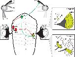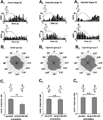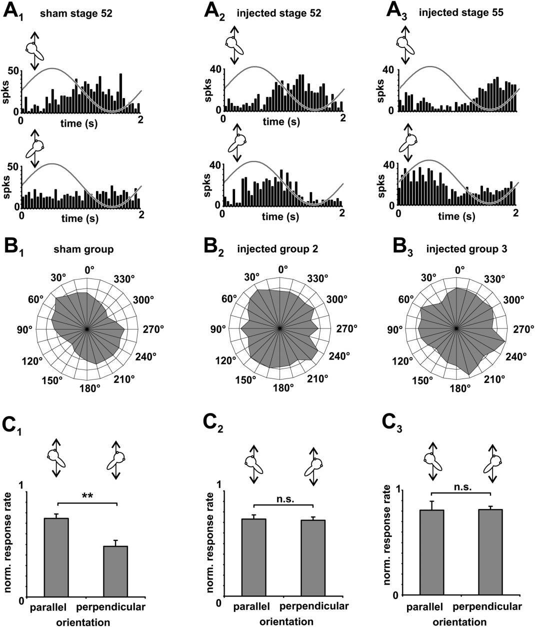 Figure 5 Absence of developmental vectorial tuning of translational motionâevoked extraocular motor responses in semicircular canal deficient and sham control Xenopus tadpoles. (A) Typical PSTHs of the discharge recorded from the left SO motor nerve during horizontal sinusoidal translation (negative sine wave indicates forward motion) at 0.5 Hz (±5 cm), averaged over a single cycle (from nâ=â20â30 cycles) in a stage 52 sham control animal (A1), a stage 52 (A2) and a stage 55 semicircular canal deficient tadpole (A3); upper and lower plots show responses with the preparation (pictograms) oriented 45° to the left (parallel to the left SO eyemuscle) or 45° to the right relative to the translational direction (perpendicular to the left SO eyemuscle), respectively. (B) Polar plots illustrating directional distributions of SO motor nerve discharge modulation magnitudes over 360° of translational motion in stage 52 sham controls (B1; nâ=â5), stage 52 (B2; nâ=â5) and stage 55 semicircular canal deficient tadpoles (B3; nâ=â4). (C) Bar plots of normalized SO motor nerve firing rate modulation during translational motion parallel and perpendicular to the SO eyemuscle (pictograms); data were obtained from the respective polar plots in B of the three groups of tadpoles (C1â3); significance of difference in the normalized response rates during motion in the two directions is indicated (**pââ¤â0.01, Wilcoxon signedârank test); n.s., not significant.