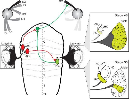 Figure 6 Schematic diagram depicting the hindbrain connectivity of bilateral vestibular endorgans and the SO eyemuscle along with the developmental changes in utricularâposterior semicircular canal contributions to the SO motor response vector. At stage 46, SO motor responses derive from the entire utricle (yellow area), whereas at stage 55, SO motor responses derive from a utricular sector that aligns with the PC on the same side. AC, PC, HC, anterior, posterior vertical, horizontal semicircular canal; ACc, inhibitory commissural AC neuron; ACi, inhibitory AC neuron; IO, inferior oblique; IR, inferior rectus; LR, lateral rectus; MR, medial rectus; PCe, excitatory PC neuron; r1â8, rhombomere 1â8; SR, superior rectus eyemuscle; Tro, trochlear motoneurons.