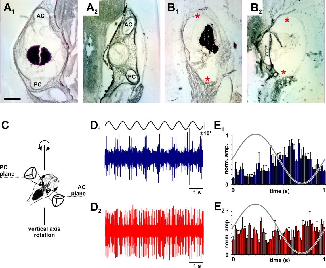 Figure 4 Morphoâphysiological correlates of semicircular canal deficient stage 52 Xenopus tadpoles following prior intraotic injections of hyaluronidase at stage 44. (A and B) Horizontal sections through the left and right otic capsules at a ventral (A1,B1) and a more dorsal level (A2,B2) in a stage 52 sham control (A) and an ageâmatched animal in which semicircular canal formation was prevented (B); note the presence of clear tubular canal structures in A (AC, PC) and the lack thereof in B (red * indicates putative locations in controls). (C) Schematic view of the positional orientation of the preparation for vertical axis rotation that selectively modulates the activity of the left PCâright AC (oriented horizontally), without changing the gravity vector relative to the utricle. (D) Multipleâunit discharge modulation of the left SO motor nerve during 7 cycles of vertical axis sinusoidal motion (1 Hz; ±10°) with the preparation in an oblique vertical position (see C) in a sham control (D1) and a semicircular canal deficient tadpole (D2); upper trace indicates table position and lower traces the nerve discharge. (E) Averaged firing rates of the SO motor nerve discharge shown in D1,2 as PSTH (±SEM; nâ=â7 oscillations, respectively) for a single cycle; robust modulation occurs in the control (E1) but not in the preparation obtained from a semicircular canal deficient tadpole (E2); black sinusoid indicates table motion (negative sine wave indicates forward motion). Calibration bar in A1 represents 0.5 mm and applies to A2 and B1,2. AC, PC, anterior and posterior vertical semicircular canal.