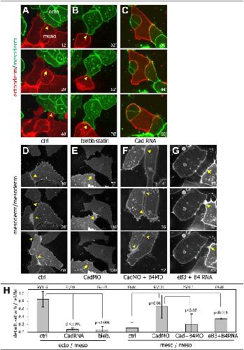 Figure 5. Tissue separation is controlled by a balance between ephrin/Eph-mediated repulsion and cadherin adhesion.(A–C) Ectoderm–mesoderm repulsion requires myosin activity and is antagonized by cadherin adhesion. Selected frames from time lapse confocal movies (Materials and Methods) showing dynamics of cell–cell contacts between single embryonic cells. Cells dissociated from ectoderm and mesoderm tissues were plated on glass coated with low amounts of fibronectin (see Materials and Methods). Ectoderm cells expressed membrane-GFP, and mesoderm cells membrane-Cherry. (A) Wild-type ectoderm and mesoderm cells stably attached to cells from the same tissue, but contacts between ectoderm and mesoderm cells exhibited cycles of attachments (arrowheads) and detachments (arrows) recapitulating the separation behavior observed at the boundary between the two tissues. (B) After treatment with 100 µM blebbistatin, most ectoderm mesoderm contacts remained stable. (C) C-cadherin overexpression in both ectoderm and mesoderm strongly decreased detachments. Note that mesoderm cells tended then to surround ectoderm cells. (D–G) Evidence for subthreshold levels of Ephrin/Eph-mediated repulsive signals between mesoderm cells. (D) Mesoderm cells (here control MO-injected) established stable contacts (arrowheads) that were maintained (concave arrowheads) throughout the duration of the recording (1 h). (E) Cadherin-depleted mesoderm cells (cadherin MO) showed frequent figures of redetachments (arrows), indicating the existence of repulsive signals. (F) Stable contacts between cadherin-depleted mesoderm cells were rescued by simultaneous Eph depletion, demonstrating that the repulsion observed between mesoderm cells was due to ephrin–Eph signaling. (G) Detachment between mesoderm cells could be induced by increased ephrin–Eph-mediated repulsion through ectopic expression of ephrinB3 and EphB4, the “preferred” ectoderm partners for “mesodermal” EphA4 and ephrinB2. Frame numbers of the corresponding movies are indicated. (H) Quantification of the rate of attachment/detachment per cell per hour. Numbers indicate number of events per number of cells analyzed. |