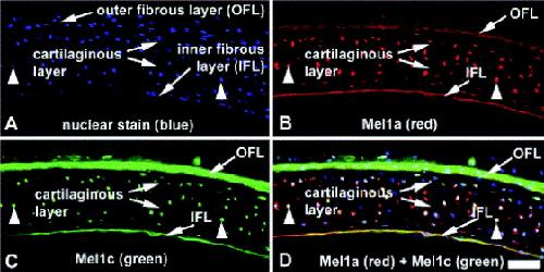 Peptide block controls for Mel1a and Mel1c labelling in the Xenopus laevis sclera. (A and C) Scleral sections were incubated with green fluorescent dye conjugated Mel1a or Mel1c receptor antibodies previously pre- incubated with their corresponding peptide and were counterstained with DAPI blue nuclear dye. Absence of green stain indicates complete block of specific antibody binding with specific peptide. (B and D) Scleral sections were incubated with red fluorescent dye-conjugated Mel1a receptor antibody together with green fluorescent dye conjugated Mel1c receptor antibody previously pre-incubated with either Mel1a or Mel1c peptide and counterstained with DAPI blue nuclear dye. Red labelling indicates areas of specific Mel1a receptor labelling in outer and inner fibrous layers (OFL and IFL; arrowheads) as well as in the cartilaginous layer and green labelling indicates areas of specific Mel1c receptor labelling in outer and inner fibrous layers (OFL and IFL; arrowheads) and in the cartilaginous layer. Scale bar=100 μm.