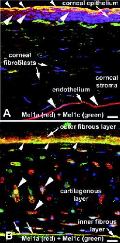 The scornea and sclera have been shown to exhibit circadian rhythms in cellular proliferation, wound healing and extracellular matrix synthesis. The distribution of melatonin Mel1a and Mel1c receptors was examined in the cornea and sclera of the Xenopus laevis eye in order to determine whether melatonin may potentially influence the growth and/or development of these ocular tissues. Sections of adult X. laevis eyes were analyzed by immunocytochemistry and confocal microscopy, using antibodies prepared against specific peptide sequences of the Xenopus Mel1a and Mel1c receptor proteins. Antibodies were pre- incubated with their appropriate antigenic peptides to control for non-specific labelling. Analysis of the distribution of Mel1a and Mel1c receptor immunoreactivity in the Xenopus eye revealed that both the Mel1a and Mel1c receptors were located in the outer fibrous layer (OFL) of the sclera, with Mel1c labelling being the most prominent. Similarly, Mel1a and Mel1c (Mel1c mostly) were also located in cells of the inner fibrous layer (IFL) with Mel1c being most abundant. The chondrocytes of the cartilaginous layer also appeared to express Mel1a, Mel1c, or both receptors. Both Mel1a and Mel1c receptor immunoreactivity were observed in the corneal epithelium and endothelium. Whereas the Mel1a antibody labelled the entire corneal epithelial layer, the Mel1c antibody labelled only the most superficial layer of epithelial cells. Cell processes of fibroblasts of the corneal stroma were immunoreactive for either Mel1a or Mel1c receptors. The identification of Mel1a and Mel1c receptors in restricted distributions in the cornea and sclera suggests that melatonin may play a role in the cellular physiology of these ocular tissues.
