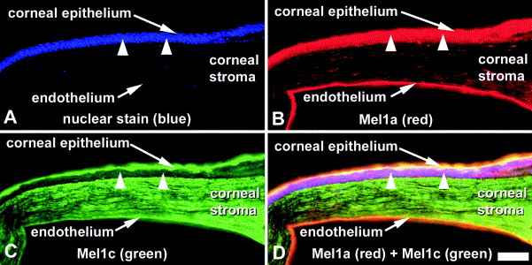 Immunocytochemistry of Xenopus laevis cornea with melatonin Mel1a and Mel1c receptor antibodies. (A) Corneal section stained with blue nuclear dye (DAPI). (B) Corneal section incubated with Mel1a receptor antibody followed by incubation in secondary antibody conjugated to a red fluorescent dye. Mel1a labelling is intense in corneal epithelium (arrowheads) and endothelium, and to a lesser extent labels cells in the corneal stroma. (C) Corneal section incubated with Mel1c receptor antibody followed by incubation in secondary antibody conjugated to a green fluorescent dye. Mel1c labelling is intense in the superficial layer of corneal epithelium and in cells of the corneal stroma. The corneal endothelium and deeper layers of epithelium (arrowheads) were weakly stained. (D) Merged image of Mel1a and Mel1c labelled cornea. Yellow color indicates areas of co- localization of Mel1a and Mel1c. Scale bar=100 μm.