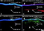Confocal image of the differential distribution and co- localization of Mel1a and Mel1c receptor immunoreactivity in the Xenopus laevis cornea and sclera. Sections of Xenopus eyes were incubated first with the Mel1c receptor antibody and labelled with a green fluorescent dye-antibody conjugate then incubated with the Mel1a antibody labelled with a red fluorescent dye-antibody conjugate and analyzed by confocal microscopy. The merged image of Mel1c and Mel1a immunolabeling demonstrates the differential expression and co-localization of the two receptor types. (A) The two receptors appear to have some co- localization in the superficial layers of the corneal epithelium (small arrowheads), as indicated by the yellow fluorescence. Only the Mel1a red immunolabeling appears in the deeper layers of the corneal epithelium (large arrowheads). Some specific Mel1c green immunolabeling appears in corneal fibroblasts (small arrows) and in the corneal endothelium (large arrowheads), but the labelling that occurs in the non-cellular corneal stroma was determined to be artifact. In additional its expression in the corneal epithelium, Mel1a is present in the corneal stroma fibroblasts (small arrows) and the corneal endothelium (large arrowheads). (B) The two receptors are co- localized in the deep layers of the outer fibrous layer of the sclera (small arrowheads), as indicated by the yellow fluorescence. Mel1a and Mel1c are also co- localized to the inner fibrous layer of the sclera (small arrows). The matrix of the cartilaginous layer is not immunoreactive with the antibodies, whereas the chondrocytes (large arrows) display co- localization and/or differential expression of Mel1a and Mel1c. Scale bar=20 μm.