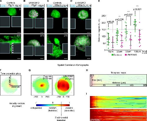 Figure 4. LPAR2 signaling is required for solid-likeâtoâfluid-like transition during NC EMT. (AâD) Invasion assay with microfluidic tunnels. Bars, 50 µm. (E) Quantification of invasion assay (19 10-µm explants from seven independent experiments; Studentâs two-tailed t test: P = 0.279; 31 25-µm explants from nine independent experiments; Studentâs two-tailed t test: P = 0.006; 22 50-µm explants from seven independent experiments; Studentâs two-tailed t test: P = 0.0018; 29 150-µm explants from eight independent experiments; Studentâs two-tailed t test: P < 0.001). (FâI) Spatial correlation kymographs. Projection of all time points (F) or temporal maps (H) where each line corresponds to a mean of three consecutive time points. Hot colors indicate a high level of correlation between two compared velocity vectors. (G) Comparison of correlation kymographs projections between control (left) and LPAR2MO (right). (I) Comparison of correlation kymographs over time between control (top) and LPAR2MO (bottom) cells. The broken line in the control data indicates at which distance between cells correlation is lost. That represents the threshold of solid-likeâtoâliquid-like behavior transition. |