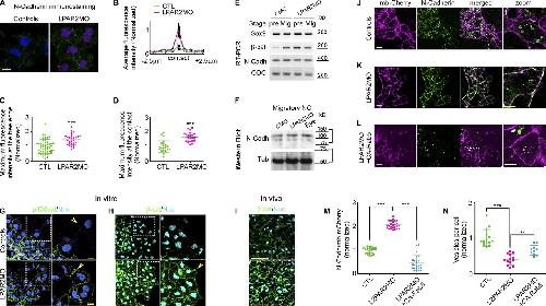 Figure 5. LPAR2 signaling controls N-cadherin internalization. (A) N-cadherin immunostaining in controls and LPAR2MO cells. Bar, 10 µm. (B) Mean normalized fluorescence intensity along the cellâcell contact area is plotted for controls (green curve) and LPAR2MO cells (magenta curve). Error bars indicate SEM. (C) Maximum fluorescence levels at the free edge (78 cells from 13 independent experiments; Studentâs two-tailed t test: P < 0.001; error bars indicate SD). (D) Maximum fluorescence levels at the cellâcell junctions (48 contacts from 13 independent experiments; Studentâs two-tailed t test: P < 0.001; error bars indicate SD) are shown for controls (green dots) and LPAR2MO (magenta dots). (E) RT-PCR for Sox 9 (NC marker), β-catenin, and N-cadherin from embryos at premigratory (stage 19) and migratory (stage 24) NC injected with control MO (CMO) or LPAR2MO. (F) Western blot for N-cadherin and tubulin from dissected NC and eye tissue of the embryos injected with CMO or LPAR2MO. (G) Localization of p120-GFP expressed in controls and LPAR2MO cells. (H and I) Immunostaining for endogenous β-catenin in controls and LPAR2MO cells performed in vitro (H) or whole mount staining of dissected cranial tissues (I). Boxed regions are enlarged on the right. (JâL) Pulse-chase assay with NC cells injected with N-cadherin HaloTag (green) and membrane-mCherry (magenta) in controls (J), LPAR2MO cells (K), or cells coinjected with LPAR2MO and activated Rab5 (L). Boxed regions are enlarged in the âzoomâ column. (M) Normalized fluorescence intensity levels for N-cadherin at the cell membrane in controls (green), LPAR2MO cells (magenta), and LPAR2MO-CA-Rab5 cells (cyan). n = 73 cells from three independent experiments. One-way ANOVA: P < 0.0001. Individual comparisons: **, P < 0.01; ***, P < 0.001. Error bars indicate SD. (N) Normalized number of intracellular vesicles per cells in controls (green), LPAR2MO cells (magenta), and LPAR2MO-CA-Rab5 cells (cyan). n = 291 cells from three independent experiments. One-way ANOVA: P < 0.0001. Individual comparisons: **, P < 0.01; ***, P < 0.001. Error bars indicate SD. Bars: (GâI) 50 µm; (G and H, high magnification) 10 µm; (JâK) 20 µm. |