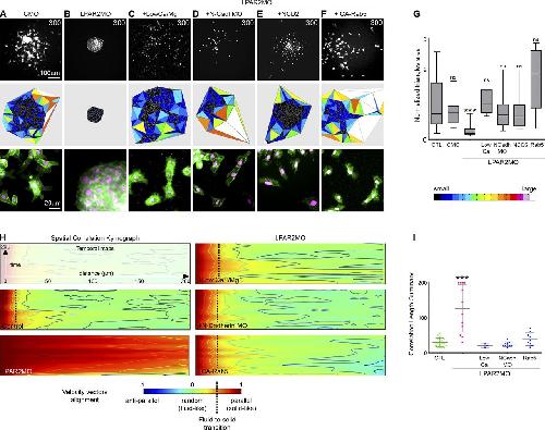 Figure 7. Inhibition of cellâcell adhesion rescues LPAR2 loss of function. (AâF) Cell dispersion assay in controls (A), LPAR2MO cells (B), or LPAR2MO cells in low calcium/magnesium conditions (C), coinjected with N-Cadherin MO (D), incubated with N-Cadherin blocking antibody (E), or coinjected with activated Rab5 (F). (G) Dispersion analysis using Delaunay triangulation from experiments shown in A. n = 103 explants from 12 independent experiments. One-way ANOVA: P < 0.0001. Individual comparison: ***, P < 0.001; ns, not significant. (H) Spatial correlation analysis. The broken line represents the solid-to-fluid transition. (I) Quantification of the spatial correlation analysis; the plot shows distances at which the alignment of velocity vectors falls below 0.5 for each experimental condition. n = 17 explants from three independent experiments. One-way ANOVA: P < 0.0001. Individual comparisons: ***, P < 0.01. |