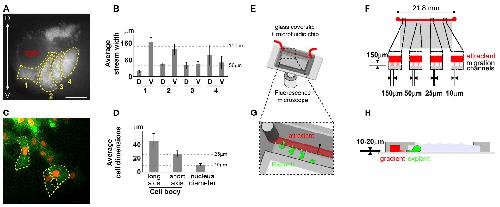 Figure S2. Using a microfluidic chamber to test 2D migration under physical constraints. (A) In vivo NC migration. The broken lines outline NC streams. Bar, 150 μm. (B) Minimum and maximum width of the four NC streams in vivo. (C) In vitro NC migration. The broken lines outline NC cells. Bar, 25 μm. (D) Mean width of the cellâs long and short axis and mean nucleus diameter. (EâH) PDMS microfluidic chamber contains tunnels 10, 25, 50, and 150 μm wide by 120 μm long and îº10â20 μm high mounted on a glass coverslip. The dish is coated with Fibronectin and the tunnels separate a closed compartment that is filled with Stromal cellâderived factor 1 (red) and an open compartment where explants are seeded in front of the tunnels. |