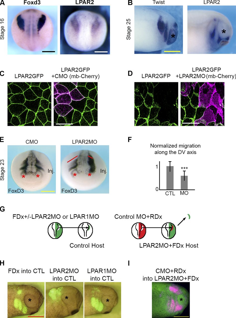 Figure 1. LPAR2 signaling is required for in vivo NC migration. (A) In situ hybridization for Foxd3 and LPAR2. (B) In situ hybridization for Twist and LPAR2. Asterisks indicate eyes. (C) Control Morpholino coinjected with membrane-mCherry into animal caps expressing 5â²UTR-LPAR2GFP. (D) LPAR2 Morpholino coinjected with membrane-mCherry into animal caps expressing 5â²UTR-LPAR2GFP. Note the absence of LPAR2-GFP fluorescence in the cell injected with LPAR2MO. (E) Frontal view of embryos injected with Control MO (CMO) or LPAR2MO, Foxd3 in situ hybridization. Asterisks, eyes; Inj., injected side; red lines, normal migration in control side. (F) LPAR2MO-injected embryos have NC migration defects (41 embryos were analyzed). Studentâs t test (two-tailed): ***, P < 0.005; errors bars indicate SD. (G) Grafting procedure. (H) Graft of control (left) or LPAR2MO (middle) or LPAR1MO cells (right) labeled with FDx (green) into host embryos. (I) Graft of control NC cells labeled with rhodamine-dextran (RDx, red) into LPAR2MO host (FDx, green). Bars: (A, B, E, H, and I) 0.5 mm; (C and D) 100 µm. |