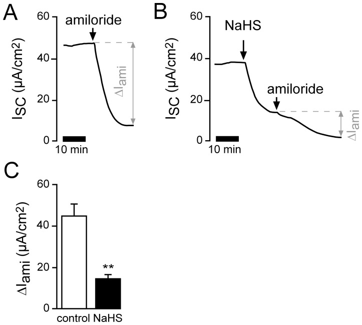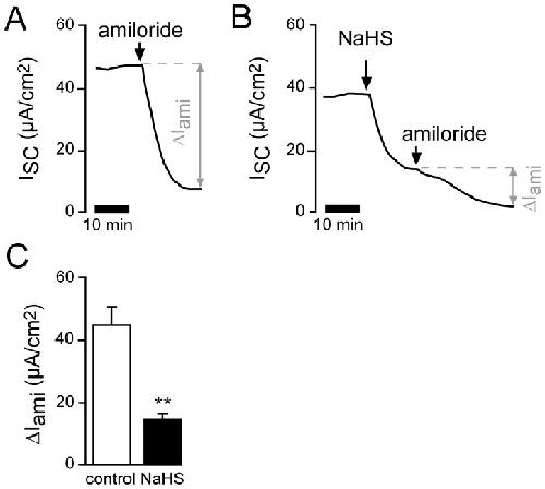 Figure 2. H2S inhibits amiloride-sensitive Na+ absorption.A) Representative current trace of a control experiment. In order to estimate the amount of Na+ absorption, the ENaC inhibitor amiloride (10 µM) was applied apically. B) Similar experiment showing the effects of amiloride after apical pre-treatment of the lung epithelium with apical NaHS (1 mM). C) Statistical evaluation of experiments as shown in panels A and B. Depicted are amiloride-sensitive (ΔIami) current fractions. NaHS significantly reduced ΔIami from 45.04±5.55 µA/cm2 to 14.84±1.77 µA/cm2 (n = 5; N = 3; p≤0.001).