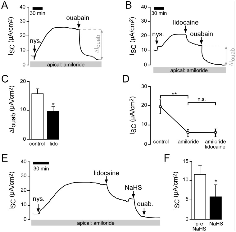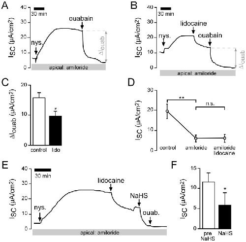 Figure 6. Interplay of basolateral K+ channels and the Na+/K+-ATPase.A) Representative current trace of a control recording. The apical membrane of the lung epithelium was permeabilized with nystatin (100 µM, apical) in the presence of amiloride (10 µM). This resulted in a current increase. When the current was stable, the Na+/K+-ATPase inhibitor ouabain (1 mM) was applied to the basolateral side. The ouabain-sensitive current fraction (ΔIouab) represents the activity of the Na+/K+-ATPase. B) After permeabilisation with nystatin, lidocaine (1 mM) was applied to the basolateral bath. This resulted in a decrease of the ISC from 17.20±2.58 µA/cm2 to 12.00±1.67 µA/cm2 (n = 5, N = 5, p≤0.05). Subsequently, ouabain-sensitive current fractions were determined. C) Statistical evaluation of experiments as shown in panels A and B. Lidocaine (lido.) significantly inhibited Na+/K+-ATPase activity (ΔIouab; n = 5, N = 5, p≤0.05). D) Without permeabilisation with nystatin, lidocaine had only a minor effect on transepithelial ion current. Depicted are mean values of non-permeabilized lung epithelia which have been treated with amiloride (10 µM, apical) followed by lidocaine (1 mM, basolateral). E) The application of NaHS (1 mM) to nystatin-permeabilized lungs which have been pre-treated with lidocaine (1 mM) additionally decreased ion current. Note that the subsequent application of ouabain was without any further effect. F) NaHS significantly decreased ISC under conditions as shown in panel E (n = 6, N = 6, p≤0.05).