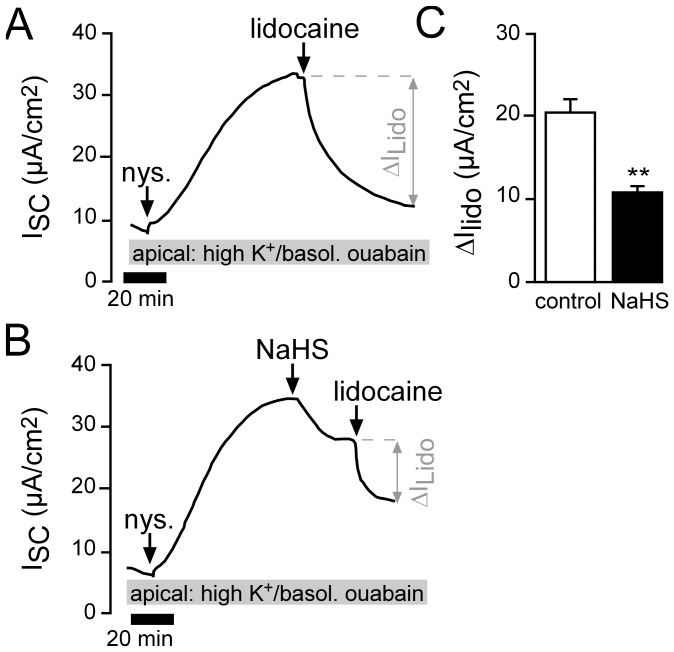Figure 5. H2S inhibits basolateral K+ channels.A) Representative current trace of a control recording. In order to measure basolateral K+ channels, lungs were apically perfused with a high K+ solution. Ouabain (1 mM) was present in the basolateral perfusate in order to exclude a contribution of the Na+/K+-ATPase. Under these conditions, the apical membrane was permeabilized with nystatin (100 µM). This resulted in a current increase which was sensitive to the nonselective K+ channel inhibitor lidocaine (1 mM). B) The application of NaHS (1 mM) after nystatin permeabilisation resulted in a current decrease (from 47.2±5.12 µA/cm2 to 36.4±2.93 µA/cm2; n = 5, N = 5, p≤0.05). Subsequently applied lidocaine had a smaller effect compared to control recordings as shown in panel A. C) Statistical evaluation of experiments as shown in panels A and B. NaHS significantly reduced lidocaine-sensitive currents (ΔILido) of the basolateral membrane (n = 5, N = 5, p≤0.01).