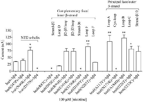 Figure 5. Variations in nAChR hα6 subunit influence the current responses of hα6hβ4-nAChRs. Mean (±SE) peak inward current responses upon exposure to 100 μM nicotine (5 sec exposure; ordinate) are estimated from oocytes (n = 6-9) voltage clamped at −70 mV and heterologously expressing the indicated nAChR subunits. Oocytes coexpressing hα6A184D (variation in loop D) and hβ4 subunits yield largest current responses to 100 μM nicotine. Comparisons of peak current responses between control (hα6hβ4-nAChR) and variant groups were analyzed using one-way ANOVA with Dunnett’s multiple comparisons test (*, p < 0.05; and **, p < 0.01). |
