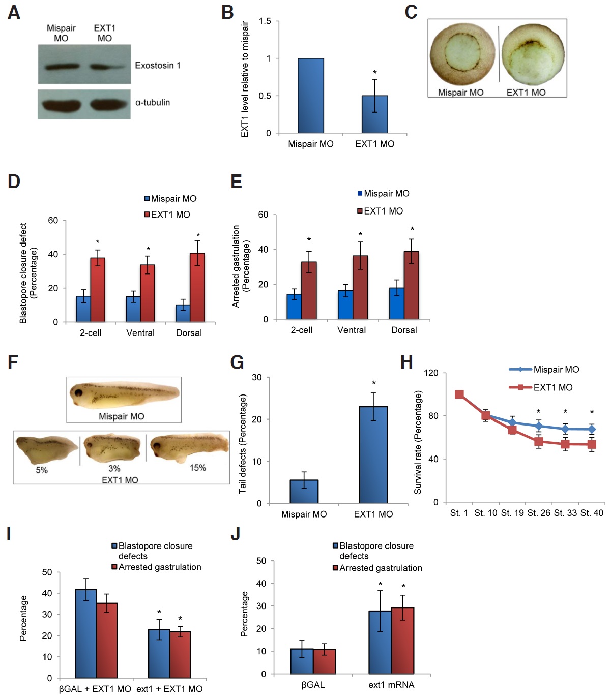 Fig. 1. Knockdown of ext1 results in gastrulation defects. (A) Embryos were injected with 20 ng of either the EXT1 MO or the mispair MO and lysed at st. 10.5 in preparation for immunoblotting to detect Ext1 and a-tubulin (loading control). Ext1 protein levels are decreased in EXT1-MO injected embryos. (B) Quantitative comparison of Ext1 protein accumulation. Relative Ext1 levels were normalized with a-tubulin. Bars represent mean ± S.D. N=3 independent experiments. (C) Midgastrula EXT1 MO-injected embryos exhibited incomplete blastopore formation and partial endoderm protrusion, whereas the mispair MO-injected embryos had a normal blastopore. (D,E) Embryos were injected with 20 ng of mispair or EXT1 MO at either the 2- cell stage or in either dorsal or ventral cells at the 4- cell stage; the phenotypes were compared at midgastrula (St. 10.5). A higher percentage of blastopore closure defects (D) or gastrulation arrest (E) were observed in EXT1 MO-injected embryos, irrespective of the stage or location of injection. N = 10 experiments, with a total of 400 embryos for each condition. (F) The phenotypes of embryos with head and tail defects in ext1 morphants. (G) The frequency of tail defects in ext1 morphants. Total number of tadpoles was 213. Bars present meant ± S.D. N=7 independent experiments. (H) The survival rates for EXT1 MO and EXT1 MIS embryos. Bars represent mean ± S.D. N=7 independent experiments (20-60 embryos/injection). (I) Blastopore closure defects and arrested gastrulation in ext1 morphants were partially rescued by coinjection with ext1 mRNA. Bars present meant ± S.D. N=5 independent experiments. (J) Embryos injected with 1ng of b-galactosidase or ext1 mRNA were collected and phenotypes were compared at gastrulation stage. The embryos overexpressing ext1 had higher frequencies of blastopore defects and gastrulation arrest compared to controls. Bars present meant ± S.D. N=5 independent experiments. * p < 0.05.