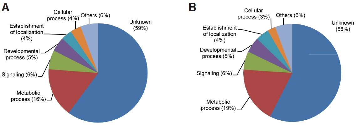Fig. 2. Gene ontology (GO) of genes showing dysregulation in ext1 morphants. We characterized genes that showed a change of greater than two fold (A) or less than 0.5 fold (B) in ext1 morphant embryos. More than half of the genes up-regulated in response to ext1 knockdown had unknown functions. Among those with known functions, 16% were associated with metabolic processes, including transcriptional and translational regulation. Signaling-associated genes accounted for 6%, while 5% were involved in developmental processes. The remainder included establishment of localization (4%), cellular processes (3-4%), and others (6%). The âothersâ category includes multicellular organismal processes, response to stimulus, cell proliferation, cellular component organization, and reproductive processes. Similar proportions were observed for genes that were down-regulated following a reduction in Ext1 expression.