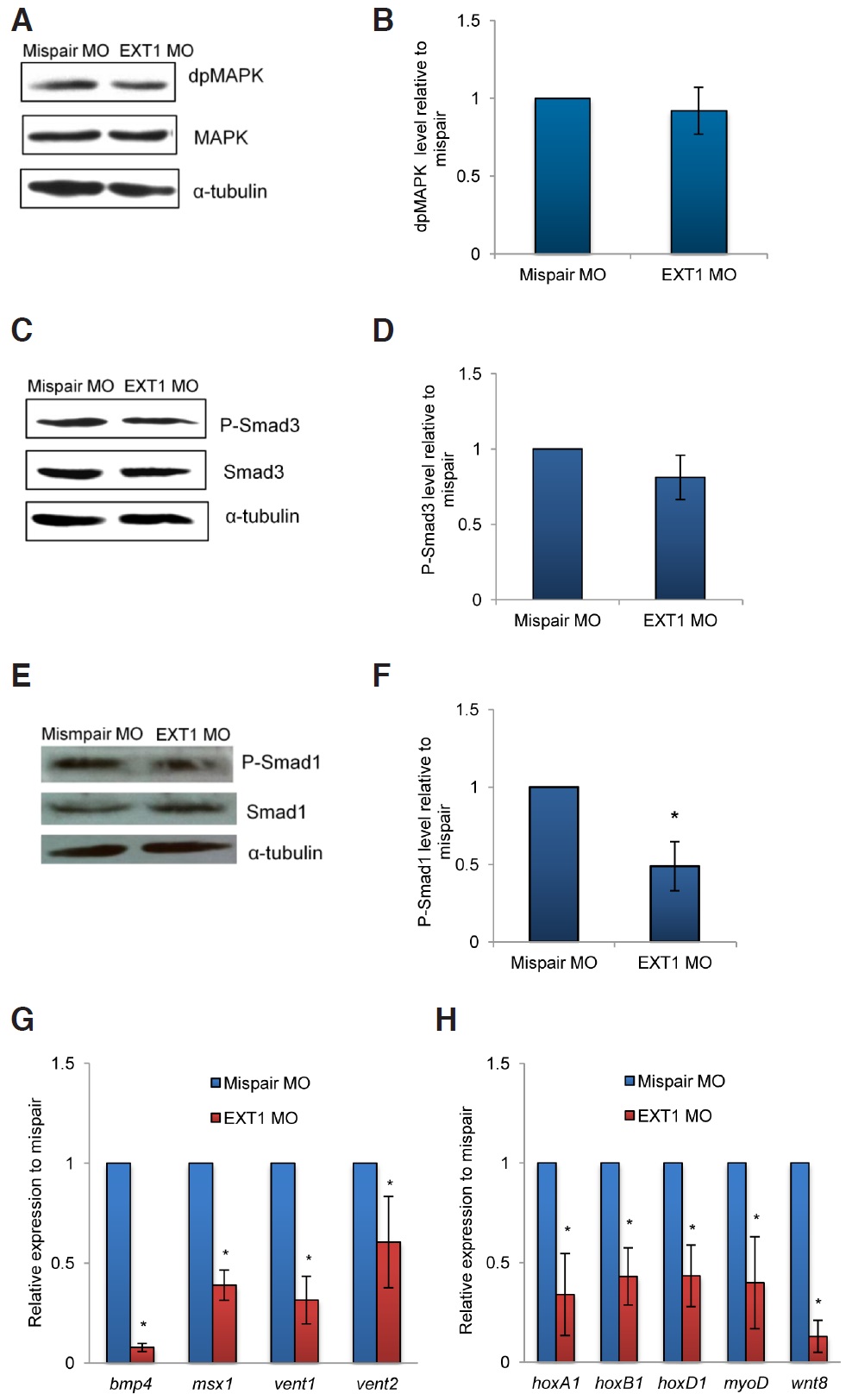 Fig. 4. The effects of Ext1 knockdown on paracrine signaling pathways. Embryos were injected with EXT1 or mispair MO and lysed at stage 10.5. (A,C,E) Immunoblots showed levels of diphospho- ErkMAPK (dpMAPK), phospho-Smad3, and phospho-Smad1 in EXT1 or mispair MO-injected embryos. (B,D,F) Relative levels of phosphorylated forms of MAPK, Smad3, and Smad1 in EXT1 or mispair MO-injected embryos. Phospho-Smad1 is reduced in EXT1 morphant embryos, whereas levels of dpMAPK and phopho-Smad3 are unchanged. (G) Q-RT-PCR assays of BMP4 and the BMP4 target genes msx1, vent1, and vent2 in control or ext1 morphant embryos. (H) Q-RT-PCR assays of wnt8 and the wnt8 target genes HoxA1, HoxB1, HoxD1, and myoD. The relative -fold change of each target gene in EXT1 MO-injected embryos was calculated as described in Fig. 3. (B,D,F-H) Bars represent mean ± S.D. N=3 independent experiments. *: p < 0.05.