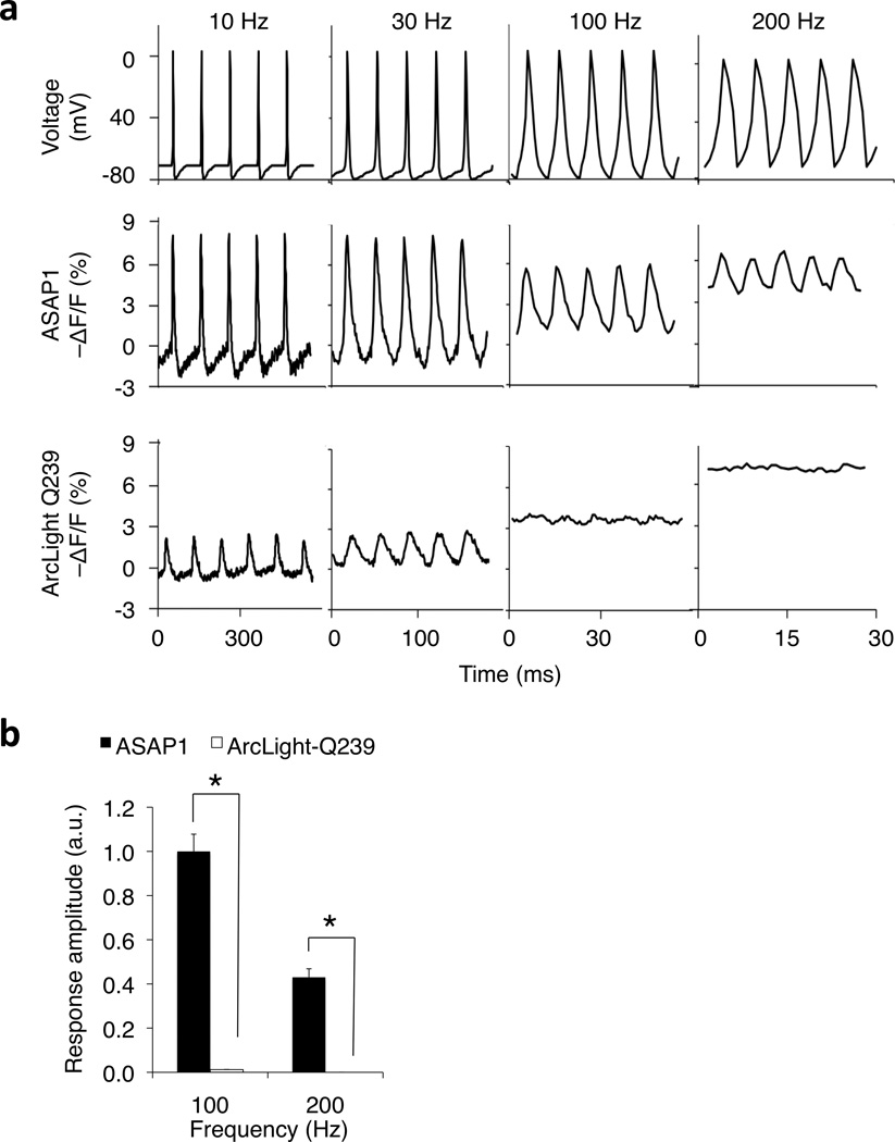 Figure 2. Monitoring simulated AP trains in voltage-clamped HEK293A cells. (a) ASAP1 followed 200-Hz trains of AP waveforms, while ArcLight Q239 followed trains of 30 Hz but not 100 Hz or 200 Hz. For each frequency, simulated trains of APs (2.0-ms FWHM, 75-mV peak amplitude) were applied for 1 second. Traces shown are the fluorescence response to 5 AP waveforms at 500 ms from the start of each train. (b) We quantified the frequency response of ASAP1 and ArcLight-Q239 to 100 Hz and 200 Hz simulated spike trains described above. We first estimated the power spectra density of the response using fast Fourier transforms. For 100 Hz trains, we quantified the amplitude of the power density peak at 100 Hz; correspondingly, we quantified the amplitude of the 200 Hz peak for 200 Hz spike trains. Consistent with subpanel (a) (bottom row) ArcLight Q239 produced little or no response at these frequencies, with mean peak amplitudes of 0.012 ± 0.001 (100 Hz) and < 0.001 (200 Hz). ASAP1 showed greater mean response amplitudes to both 100 Hz and 200 Hz simulated AP trains (100 Hz, p = 0.021; 200 Hz, p = 0.031). Differences are statistically significant following Holm-Bonferroni correction for multiple comparisons. For each train, n = 5 HEK293A cells per construct. Error bars, SEM.