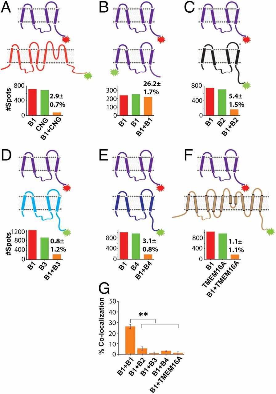 Single-molecule colocalization analysis of coassembly of hBest1 with other channel subunits. (A–F) hBest1–mCherry coexpressed with either N- or C-terminal mEGFP-tagged: CNG channel (A), hBest1 (B), hBest2 (C), hBest3 (D), hBest4 (E), or mTMEM16A (F). Total number in all experiments combined of red-alone spots (red bars), green-alone spots (green bars), and spots containing both red and green fluorescence (orange bars), with percent of red + green indicated above orange bar. (G) Average percent colocalization for 5–10 optical patches for each coinjection. Error bars indicate SEM. hBests abbreviated as B1 to B4. |