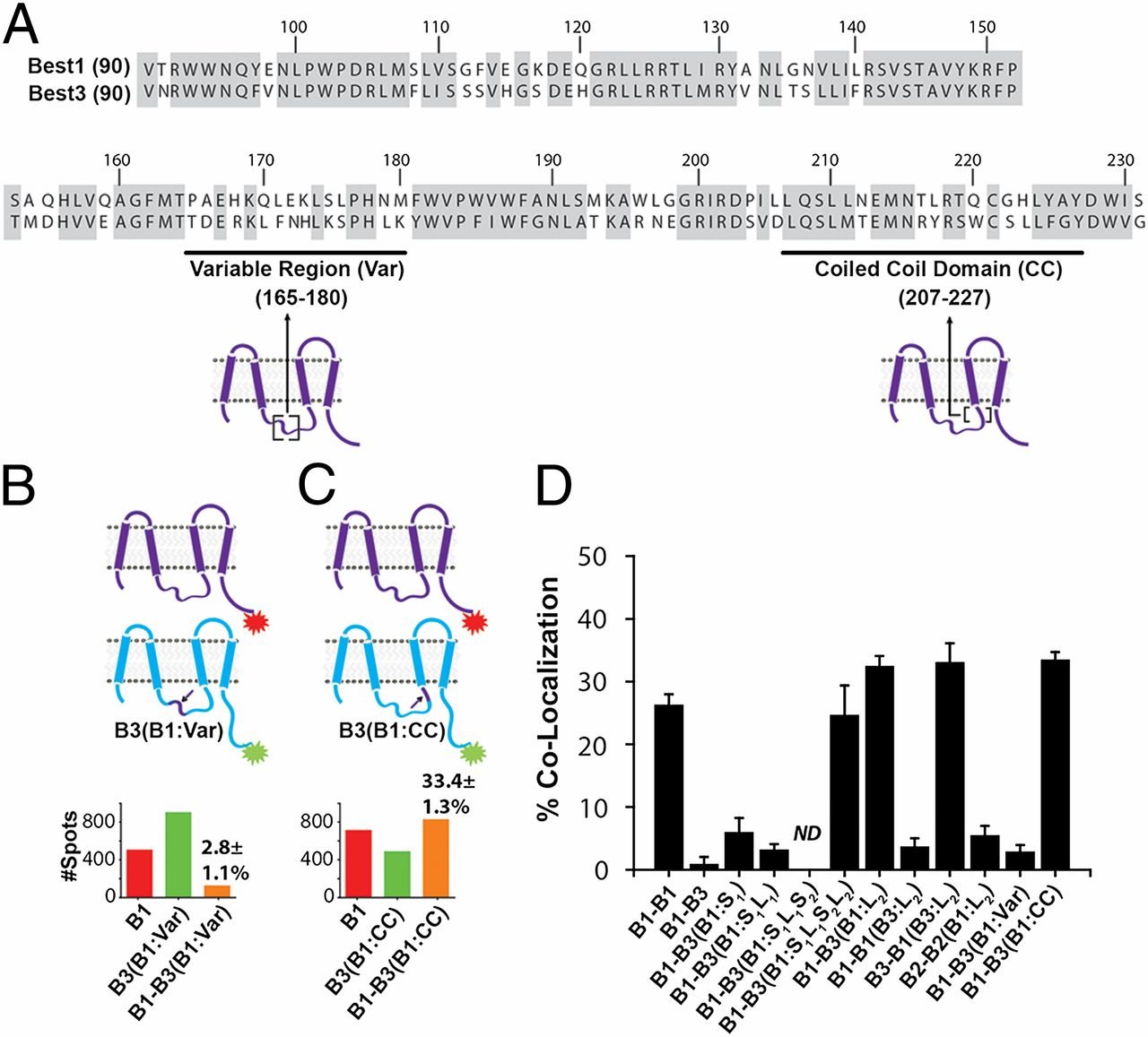 Single-molecule colocalization identifies coiled-coil domain in L2 as assembly determinant. (A) Protein sequence alignment of L2 domains of hBest1 and hBest3 shows high conservation (gray highlights), except in Var and also identifies CC. (B and C) Colocalization of B1 with B3 containing only the Var of B1 (B) or with B3 containing only the CC of B1 (C). (D) Comparison of colocalization results obtained in Figs. 2, 4, and 5. |