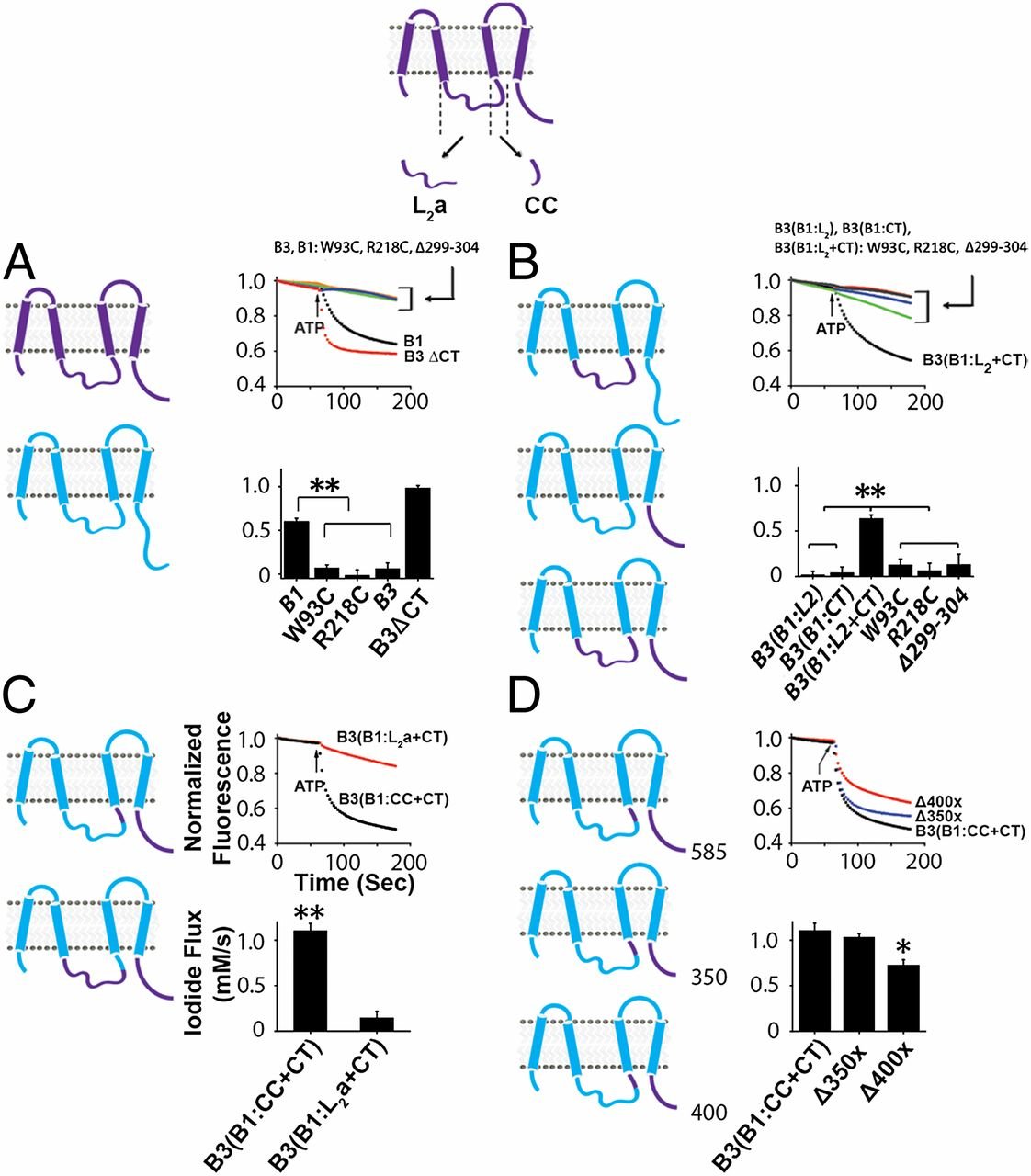 Iodide-quenching assay determines the functional role of coiled-coil domain in hBests. Comparing iodide conduction, upon activation at ∼60 s using ATP, through (A) hBest1 (black), two known hBest1-blocking mutants hBest1:W93C (green), hBest1:R218C (blue), Ca2+-binding domain deletion (∆299–304, purple), hBest3 (orange, known to have low conduction), and hBest3∆CT (red, deletion known to increase conduction). (B) B1–B3 chimeras, B3(B1:L2), B3(B1:CT) (no activity, red and gray, respectively), B3(B1:L2 + CT) (black) (activity comparable to hBest1), hBest1-blocking mutants in L2 + CT chimera, B3(B1:L2 + CT):W93C (green), R218C (blue), and Ca2+-binding domain deletion (∆299–304, purple). (C) B1–B3 chimeras either having coiled coil from L2, B3(B1:CC + CT) (black) or remainder of the L2, B3(B1:L2a + CT) (red). (D) B1–B3 chimeras either having full-length C terminus, B3(B1:CC + CT) (black) or truncated C terminus B3(B1:CC + CT∆350X) (blue) and B3(B1:CC + CT∆400X) (red). |