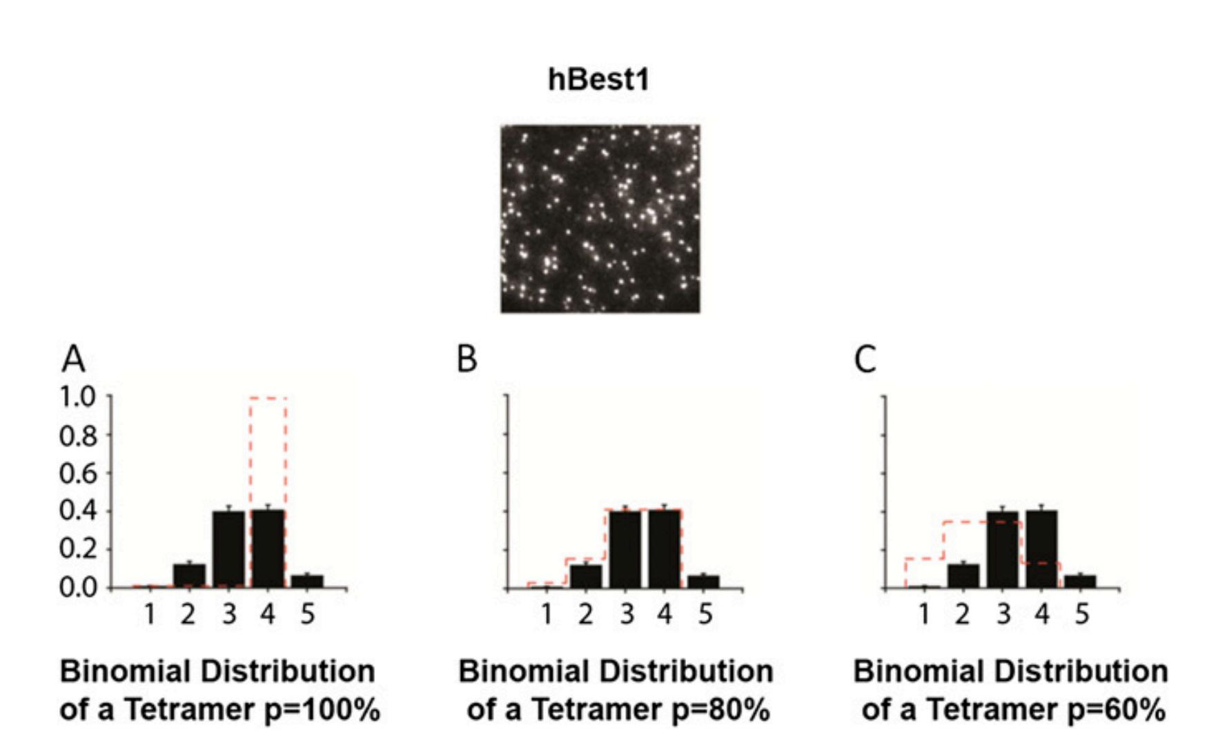 Fig. S1. Comparison of observed frequency distribution of single-molecule–photobleaching counts of hBest1 (black bars) with theoretical binomial distribution of a tetramer with probability of EGFP being fluorescent set at (A) 1.0, (B) 0.8, and (C) 0.6 (red dashed line). Note that observed distribution fits best