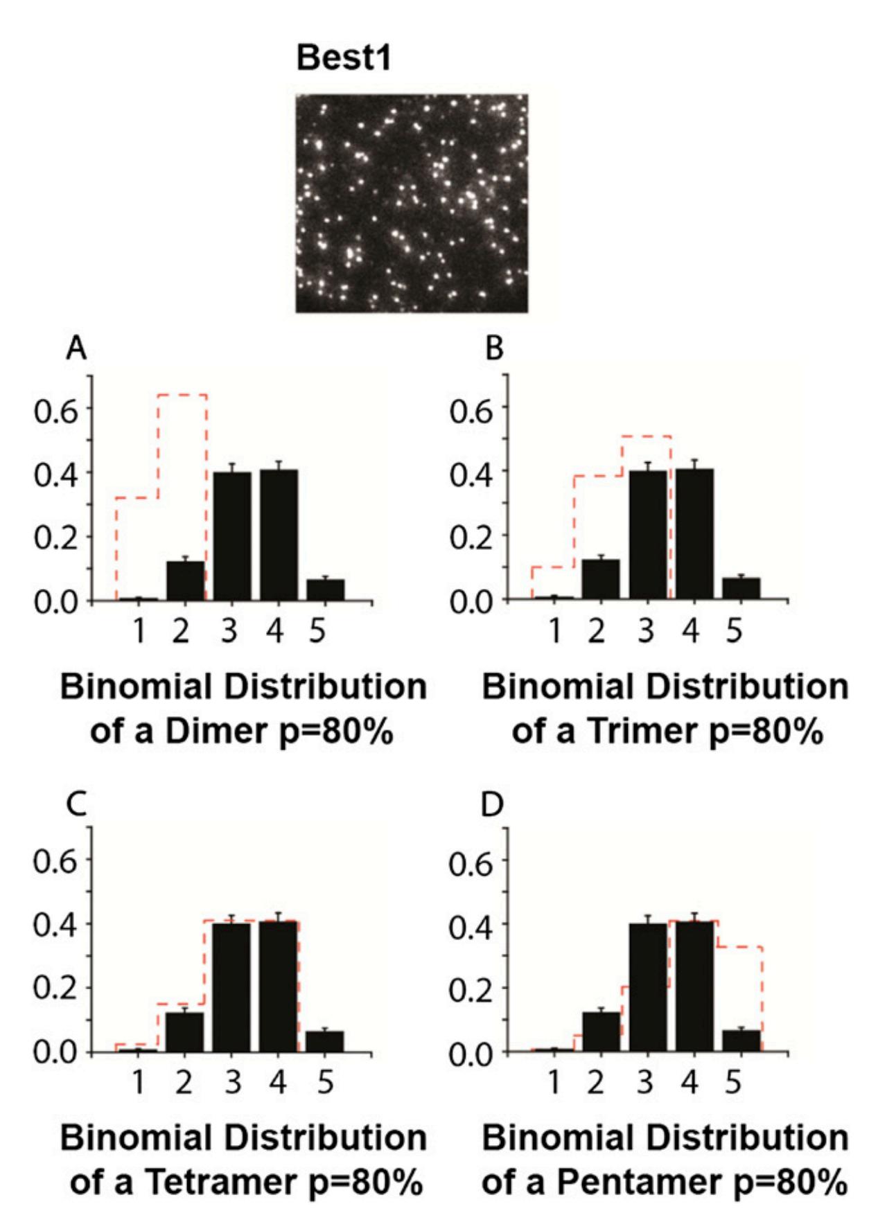 Fig. S2. Comparison of observed frequency distribution of single-molecule–photobleaching counts of hBest1 (black bars) with theoretical binomial distribution of a dimer (A), trimer (B), tetramer (C), and pentamer (D) (red dashed line) with probability of EGFP being fluorescent set at 0.80. |