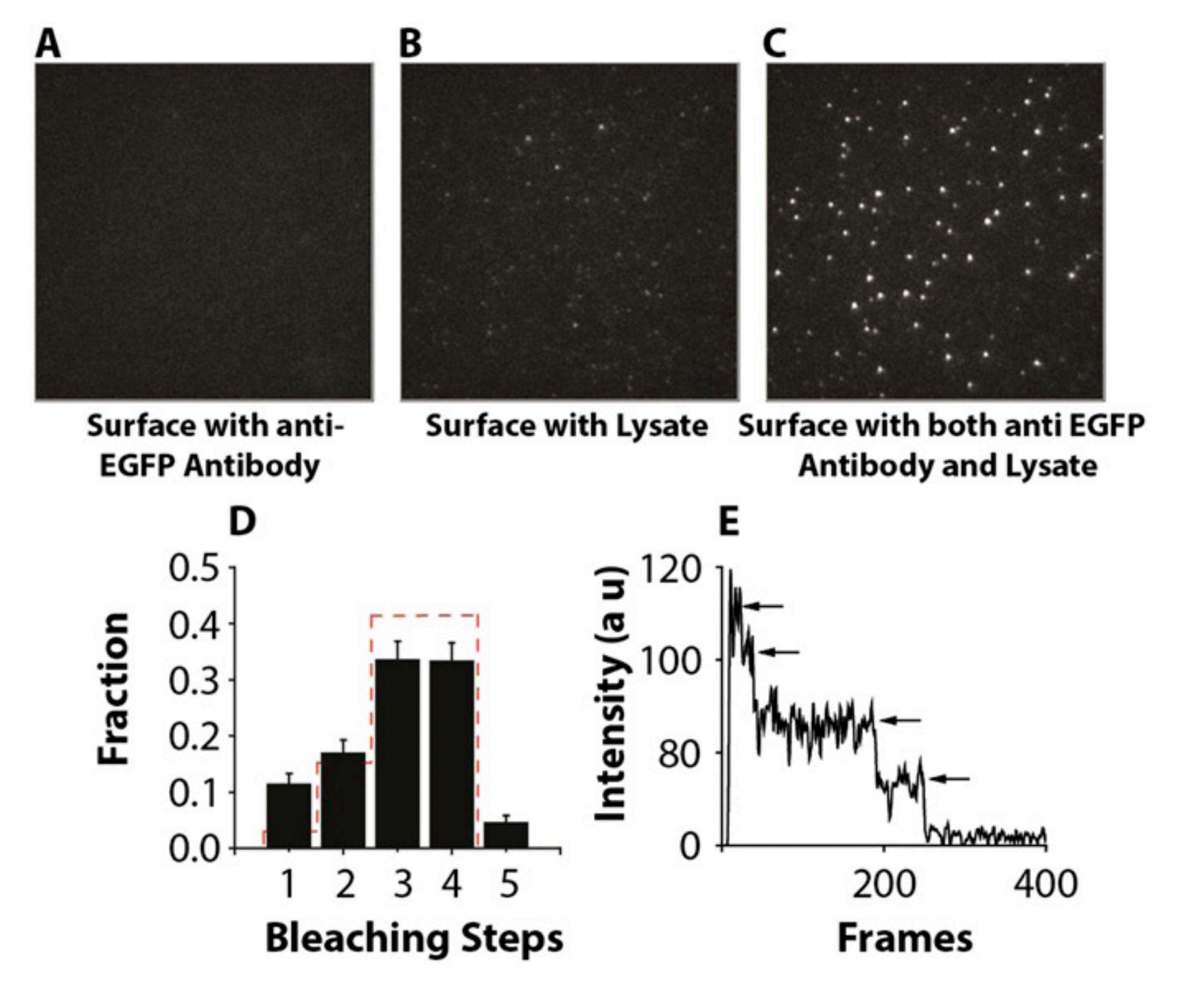 for tetramer with probability that EGFP is fluorescent = 0.80. (D) Example fluorescence traces from single spots showing four steps of photobleaching. |