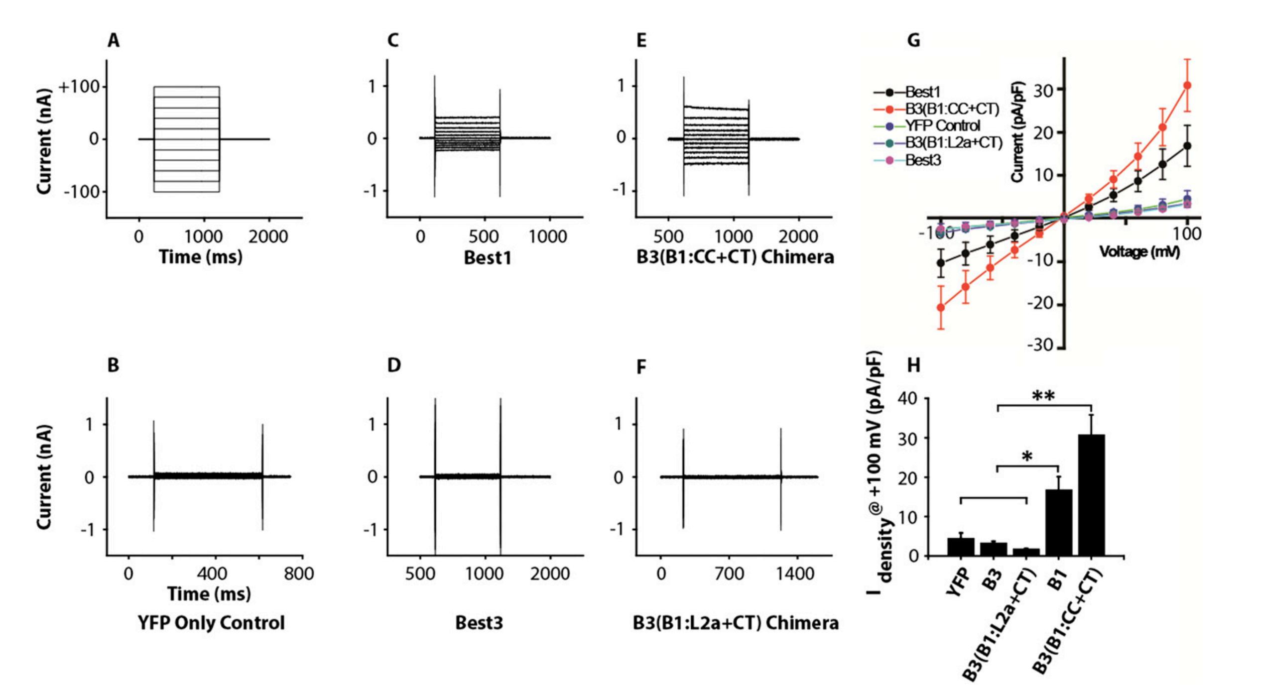 and B3(B1:L2a + CT) chimera (F). No noticeable currents were observed in YFP control, Best3, or B3(B1:L2a + CT) chimera. (G) Averaged current-voltage (I–V)