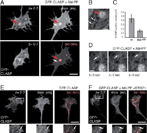 Fig. 7. High Abl-activity relocalizes CLASP to Abl induced growth cone adhesive plaques. CLASP2 localization in neuronal growth cones depends on Abl activity. Live growth cones expressing indicated constructs were subjected to fast optical sectioning by spinning disk confocal microscopy followed by deconvolution for better localization accuracy. The resulting image stacks are displayed as single optical slices (z distance to substrate in µm is indicated) and as maximum projection through the stack (max. proj.); the result of a 3D thresholding is overlaid in red (iso-data). A: GFP-CLASP2γ (GFP-CLASP) co-expression with constitutive active Abl (Abl-PP) results in accumulation of GFP-CLASP2γ in the middle of the growth cone (red arrows) close to the substrate (z = 0.2 and z = 0.7), only weak residual MT plus end tracking is detected (white arrows, see also Supporting Information Movie S2). B: Enlarged insert of A (plane z = 0.7) indicates GFP-CLASP2γ accumulation in adhesive plaques (red arrow) and localization to plus ends (white arrows). C: Quantification of GFP-CLASP2γ-positive comets per volume in wild type (wt) versus Abl-PP expressing neurons. Error bars represent standard error of the mean. (P < 0.05). D: Dynamic localization of GFP-CLASP2γ in the same growth cone as shown in A. Arrow follows CLASP2γ-positive growing MT end (see also Supporting Information Movie S1). E: GFP-CLASP2γ expressing wild-type growth cone shows typical MT plus end tracking in the periphery (white arrows in insert, see also Supporting Information Movie S2). F: GFP-CLASP2γ localization of Abl-PP expressing growth cones treated with 10 µM STI571 is indistinguishable from the localization of GFP-CLASP2γ in the control growth cone in E. Inserts show plus end tracking (see also Supporting Information Movie S3). Scale bars in A, E, and F: 10 µm; in B and D: 2 µm. Magnified inserts in E and F are 10 µm × 5 µm and 9 µm × 5 µm in size, respectively. |