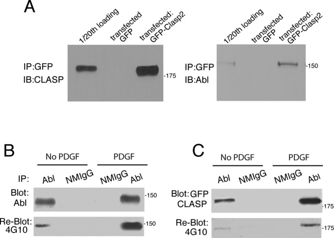 Fig. 2. CLASP2 phosphorylation and interaction with Abl are enhanced by PDGF treatment. A: CLASP2α is associated with endogenous Abl. Lysates from HEK293T cells transfected with either GFP-CLASP2α or GFP (as indicated above lanes) were immunoprecipitated with anti-GFP antibody, probed with anti-CLASP2 (a gift from Anna Akhmanova left panel), stripped and reprobed with anti-Abl antibody (right panel). 1/20th of lysates from cells transfected with GFP-CLASP2α were loaded as controls. B: Increased phosphorylation of Abl after PDGF stimulation. Abl was immunoprecipitated from GFP-CLASP2α transfected 293T cells, which were serum starved and subsequently treated with PDGF for 5 min. A similar level of Abl was immunoprecipitated with and without stimulation (upper panel anti-Abl) while its phosphorylation was increased significantly after PDGF treatment as revealed by anti-phosphotyrosine antibody 4G10 (lower panel). C: PDGF increases association between Abl and CLASP2. Upper panel shows CLASP2 immunoprecipitated by Abl antibody. Lower panel shows phosphorylated CLASP2 by 4G10. GFP transfection alone does not change 4G10 signal (data not shown). |